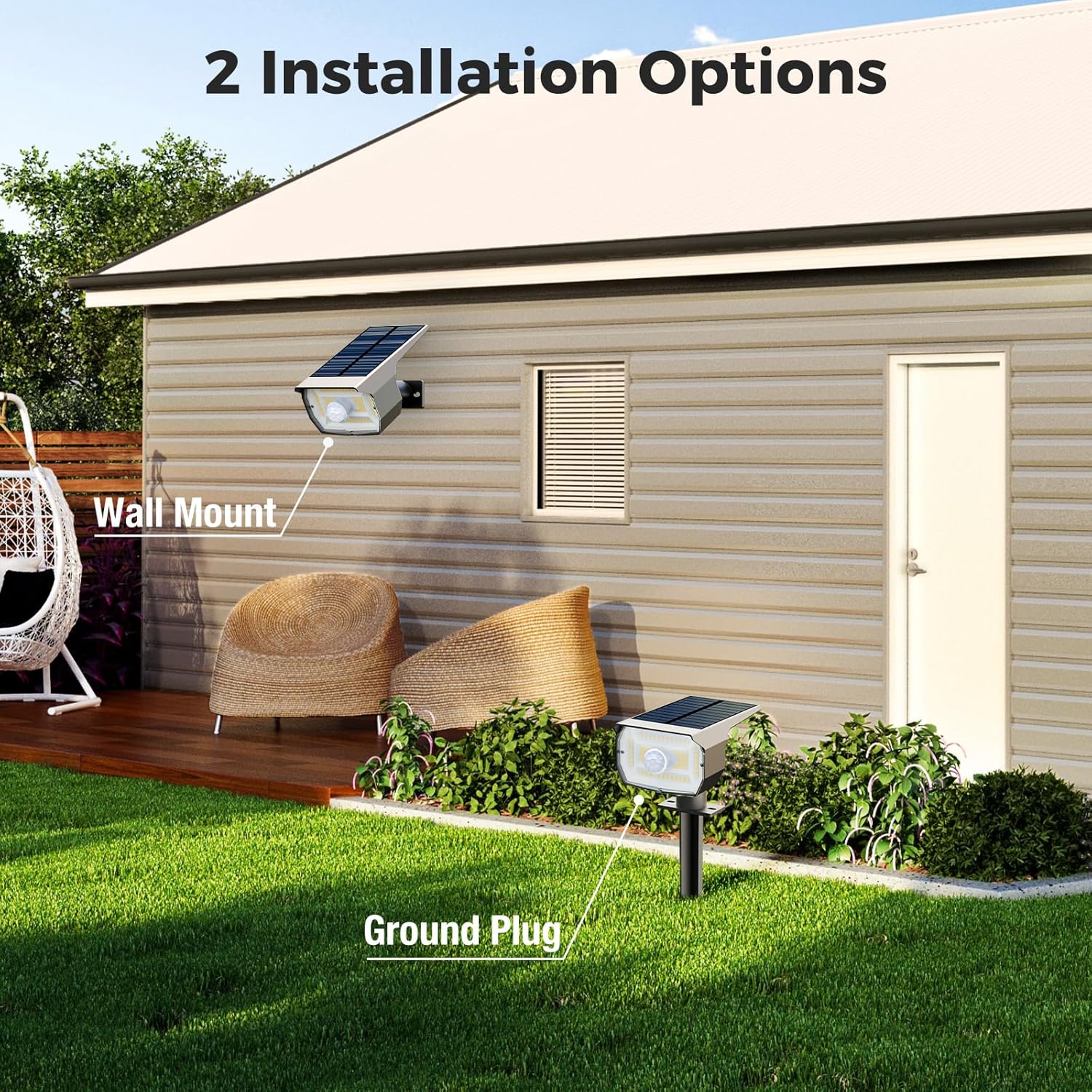 - 3 Lighting Modes & Motion Sensor: Solar spotlights have a built-in sensitive PIR motion sensor, which can easily capture motion. There are 3 modes:1.[Sensor light mode]: full brightness when the motion is detected,close when no motion.2.[Dim light sensor mode]:low brightness no motion,full brightness when the motion is detected 3.[ Constant light mode]: auto power on at night, auto power off during the day