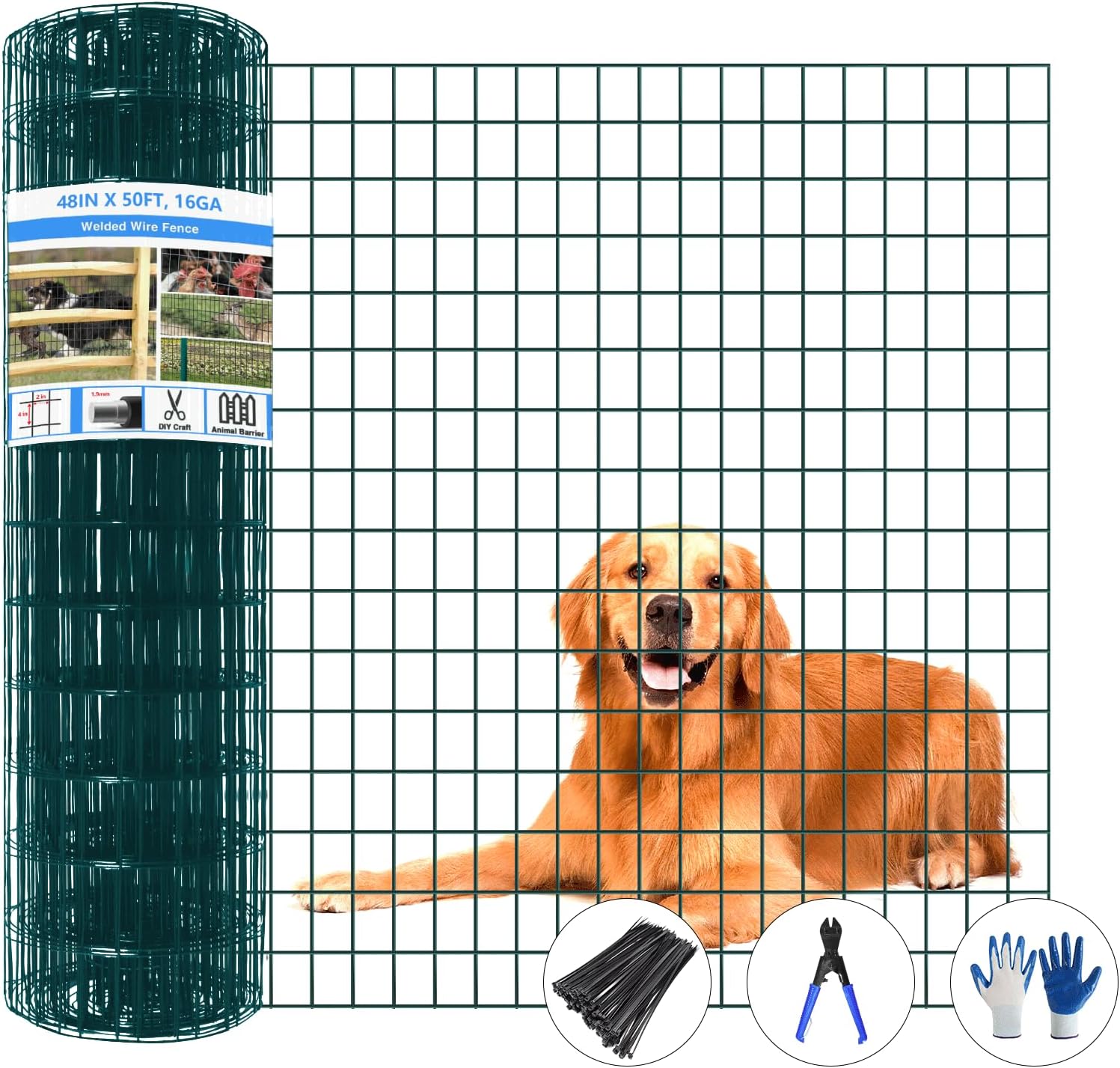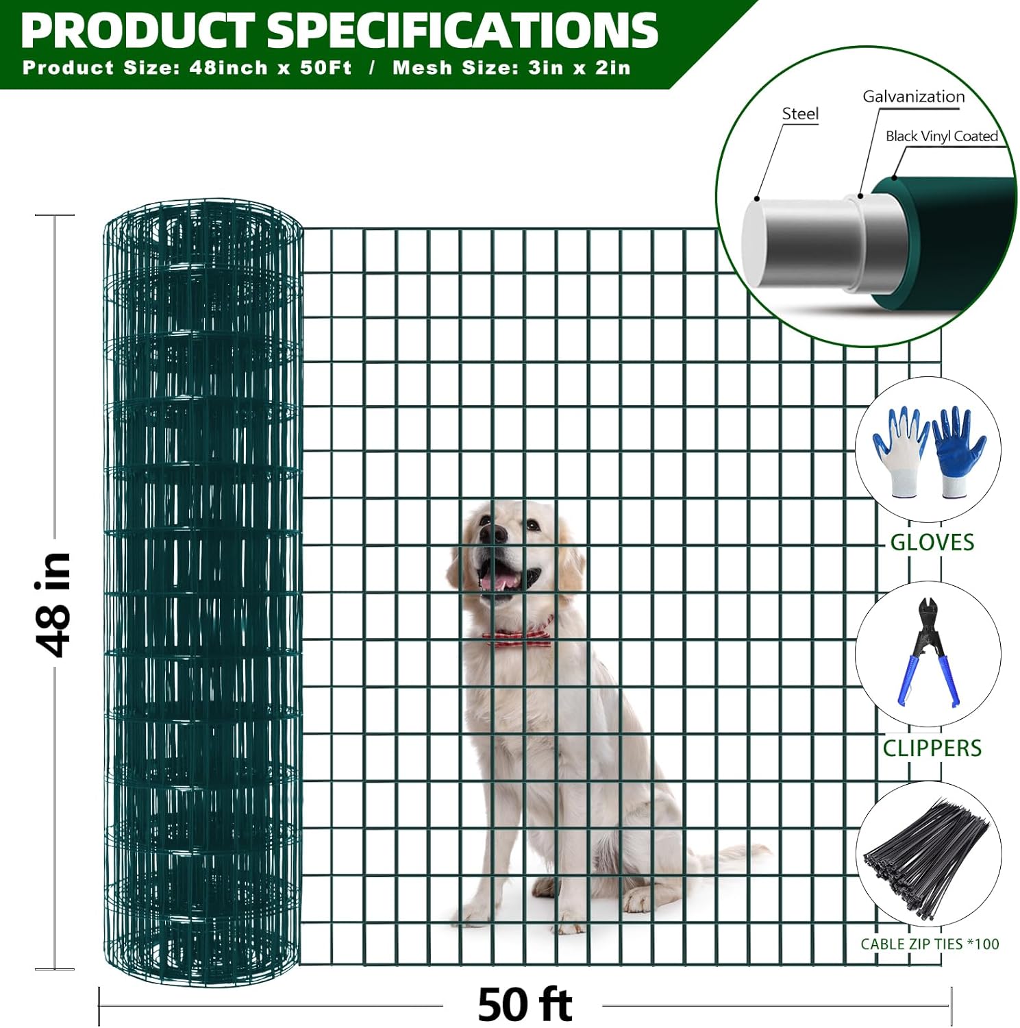 Welded Wire Fence, 50ft(L) x 48inch(H) Garden Fence for Dog, 2 Inch x 3 Inch 16GA Fencing for Chicken, PVC Coated Anti-Rust Roll Metal Wire Mesh Fence for Yard Vegetable, Green