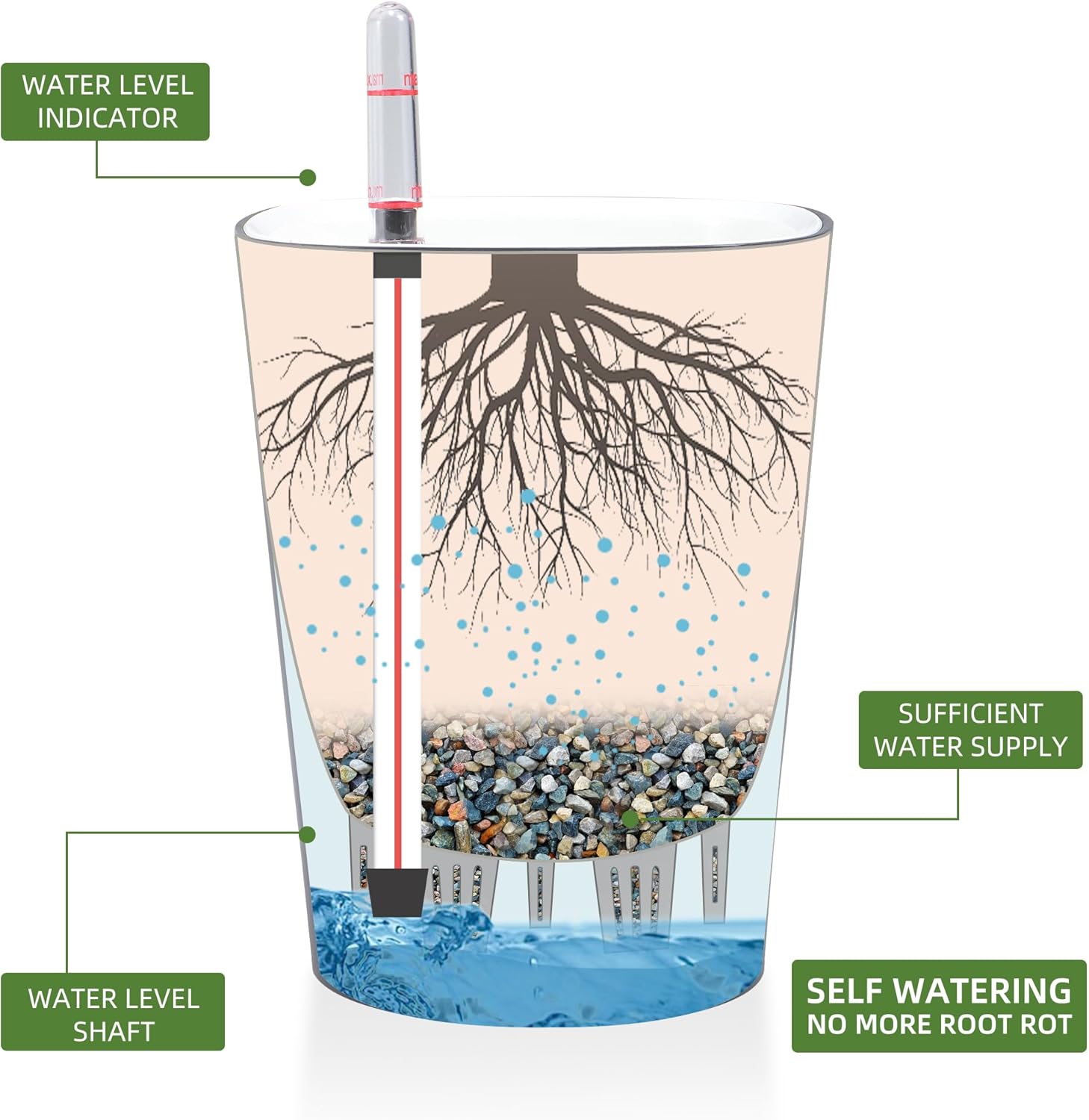 - SELF WATERING & NO MORE ROOT ROT - The smart unique sub-irrigation system is one of the most appealing aspects among all Dexceder planters. The easy-to-use separated integrated water reservoir or catcher- keeps your soil well aerated and automatic supplies plants with the right amount of ongoing moist air & nutrition for optimal growth. The insert indicator shows you the exact time to water again. The full water supply period can single-handedly last over 3 weeks based on different live plants