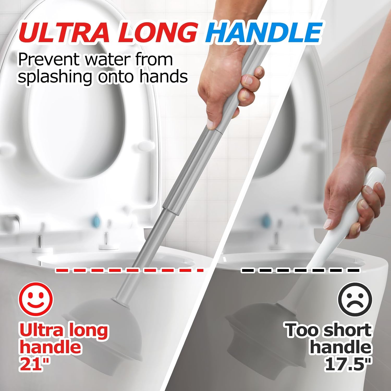 • ♦Extended handle -Heavy Duty Toilet Plunger: Compared to ordinary handles, our upgraded extended handle provides a better user experience and prevents stains from splashing onto the hands.A professional powerful suction cup that can solve various blockage problems. Comfortable handles provide greater support during use.