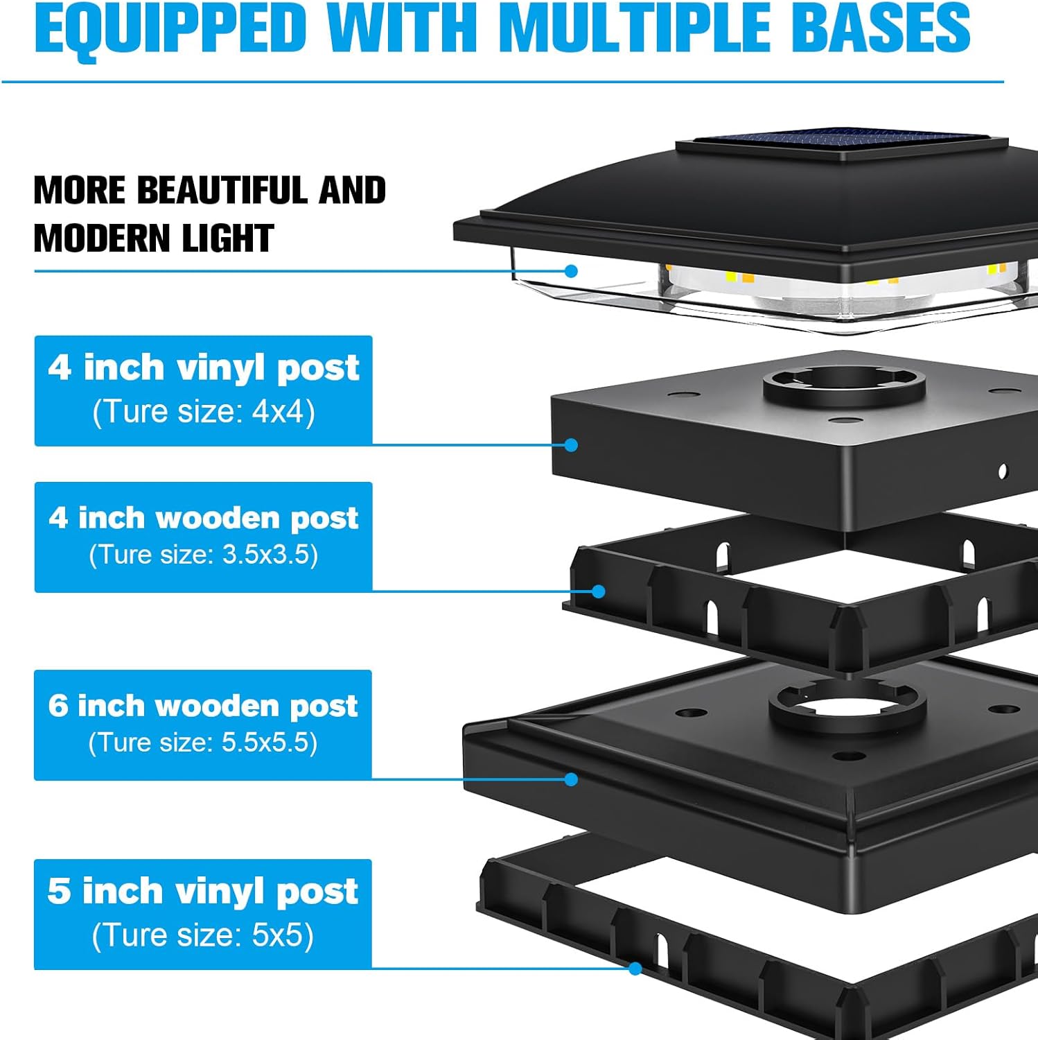 - 【Fit for post size】Our solar deck post cap lights come in various sizes. It is suitable for 4x4 wooden post, 6x6 wooden post, 4x4 vinyl post, 5x5 vinyl post. It can illuminating fences, decks, mailboxes,making them a versatile and stylish addition to any outdoor space