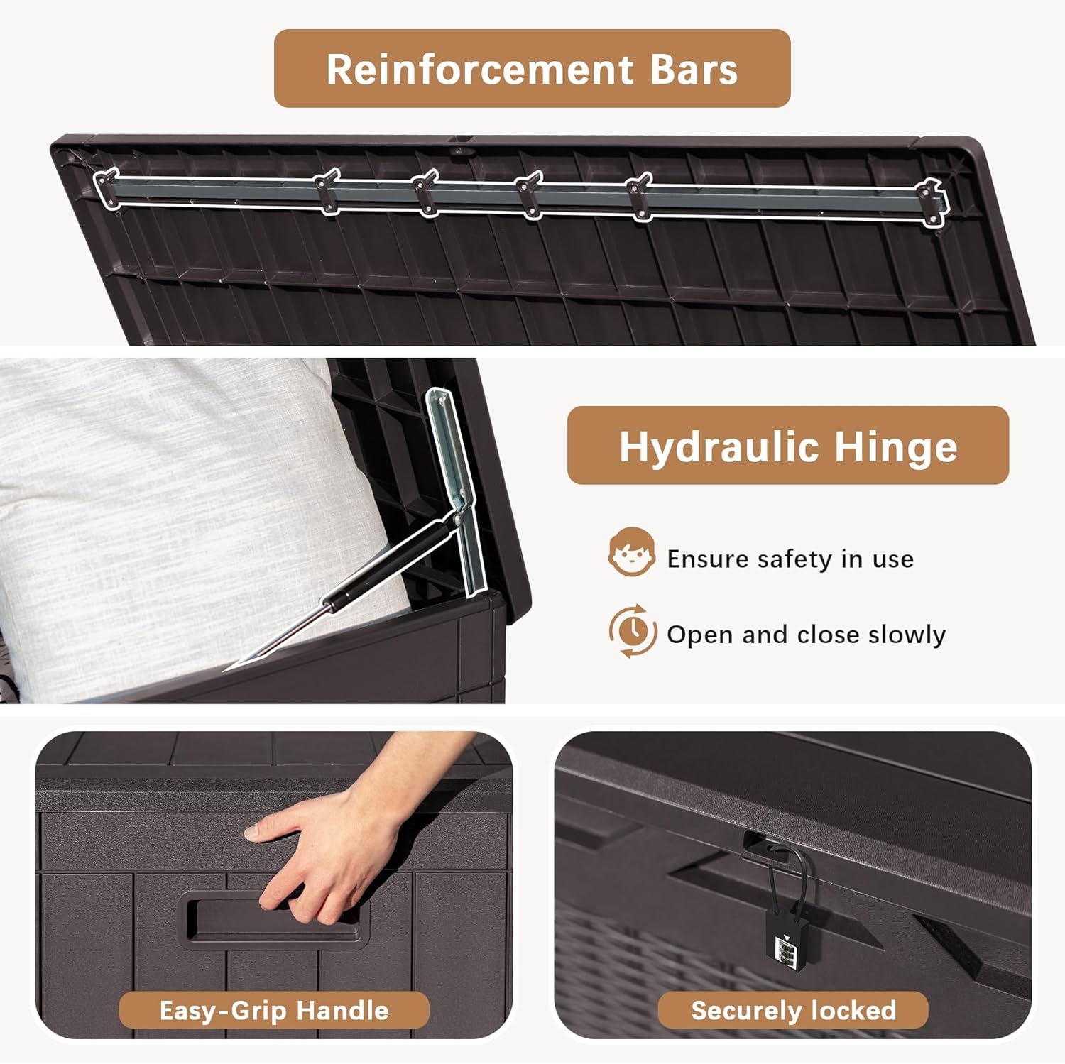 - Resistant Resin Material: Deck box is made of waterproof resin, with a complementing rattan pattern design, effectively preventing fading and rusting, while also maintaining a fresh appearance even with all-weather use.