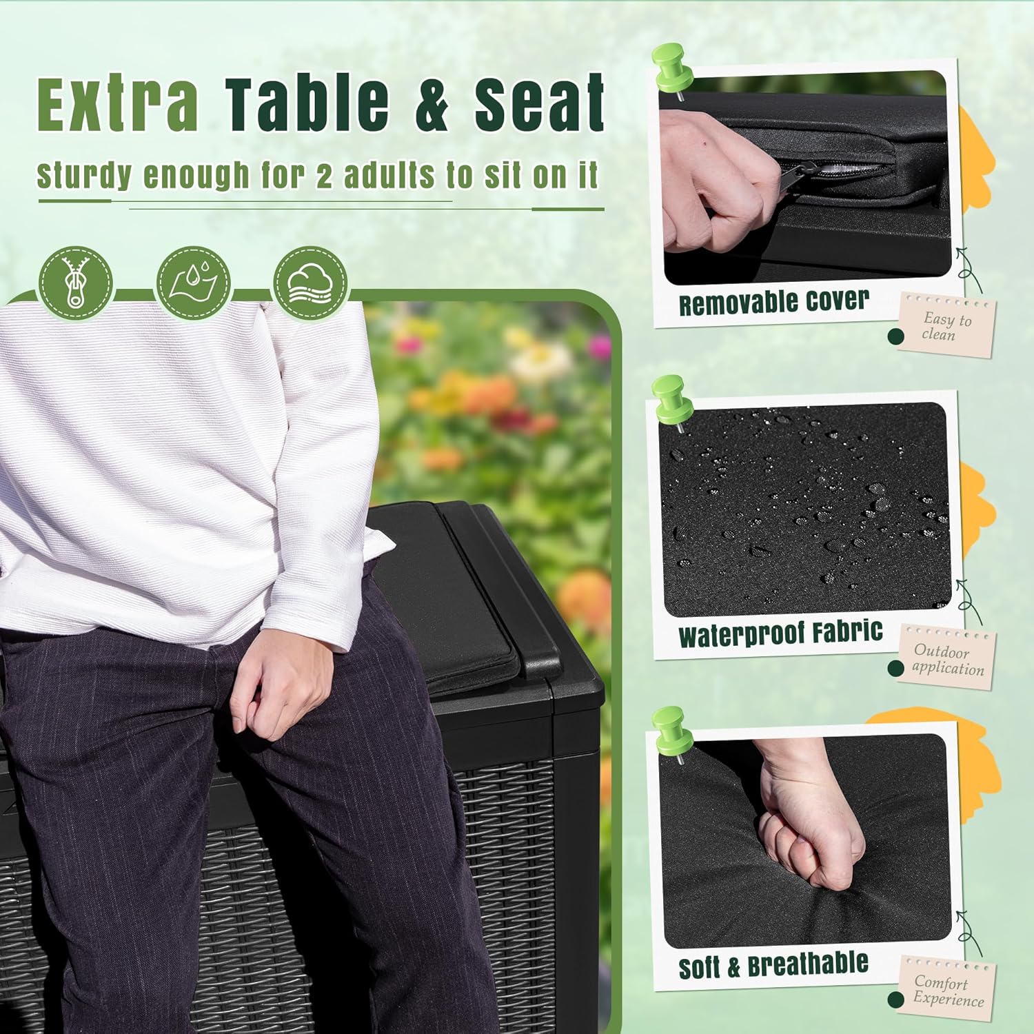 • EXTRA CUSHION:Besides helping you to organize your space, the deck box is equipped with a removable thick cushion, you can also use it as a stool to ensure your safety when opening and closing the box.