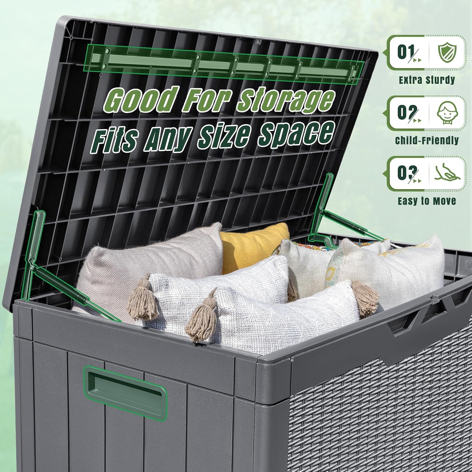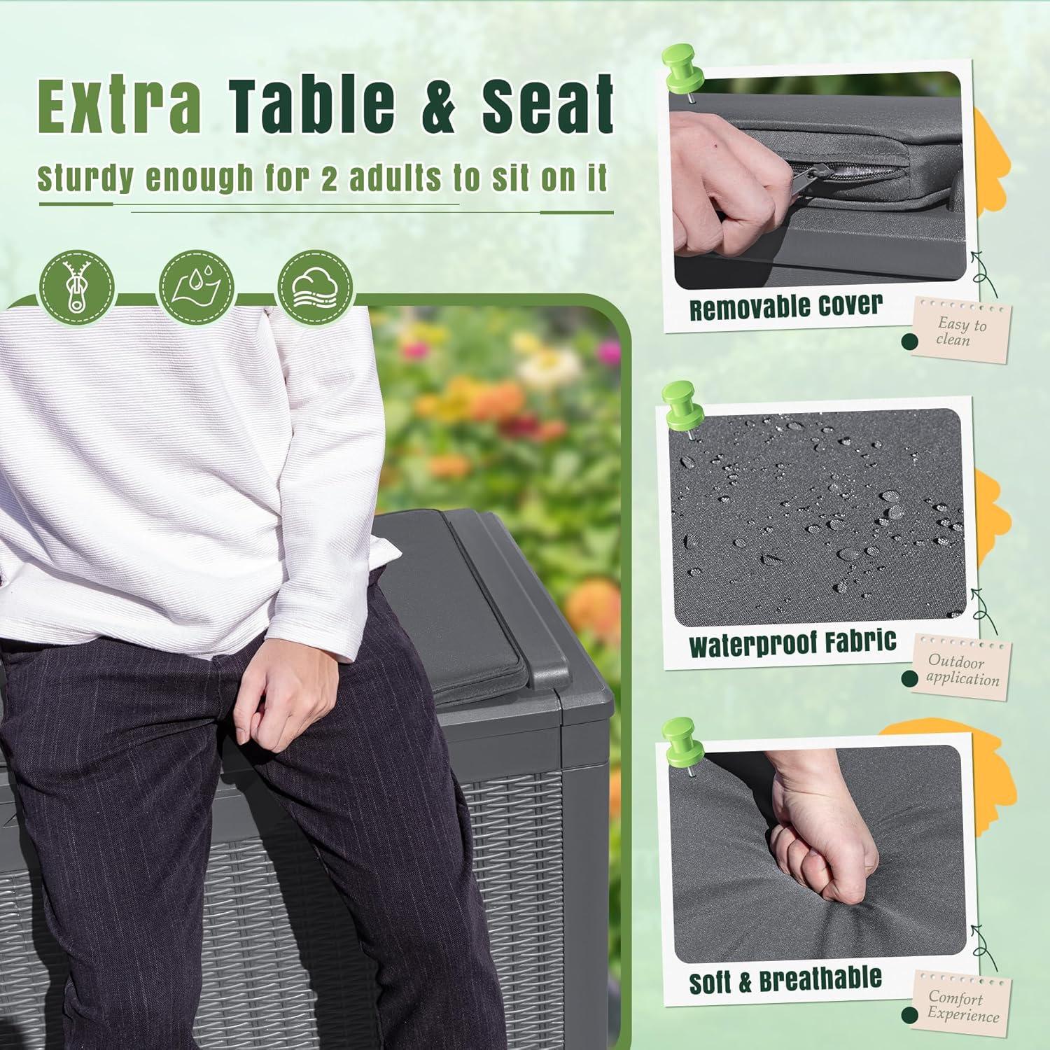 • EXTRA CUSHION:Besides helping you to organize your space, the deck box is equipped with a removable thick cushion, you can also use it as a stool to ensure your safety when opening and closing the box.