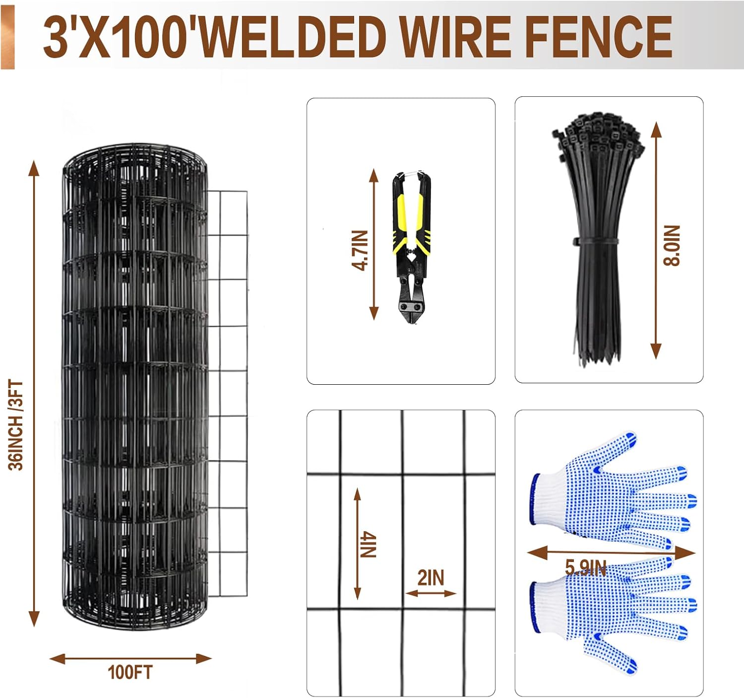 Tongmo 3 ft x 100 ft Black PVC Coated Welded Wire Fence, 16GA Garden Chicken Wire Fence Roll, Mesh Size 2" x 4" Hardware Cloth, Ideal for Yard Protection and Poultry Netting