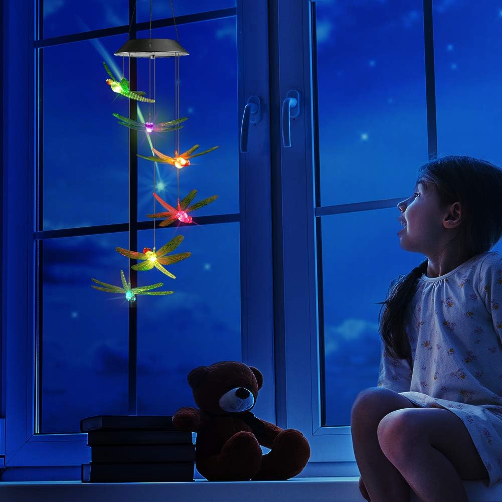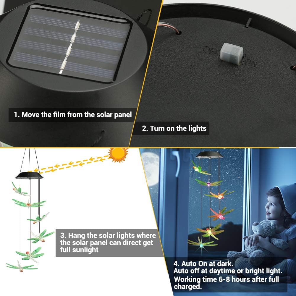 - ăSolar Powered Wind Chimesă Featuring a unique design with 6 dragonfly shaped lights charge automatically in the daytime and light up at night, free your hands, new version solar panel absorbs energy quickly, the solar Christmas lights can last up to 8-10 hours after fully charged.ďźChristmas Lights, Christmas Decorations, Gift for Mom, Gifts for Grandma, Mom Gift, Grandma Gift, Birthday Gift for Mom, Birthday Gift for Grandmaďź