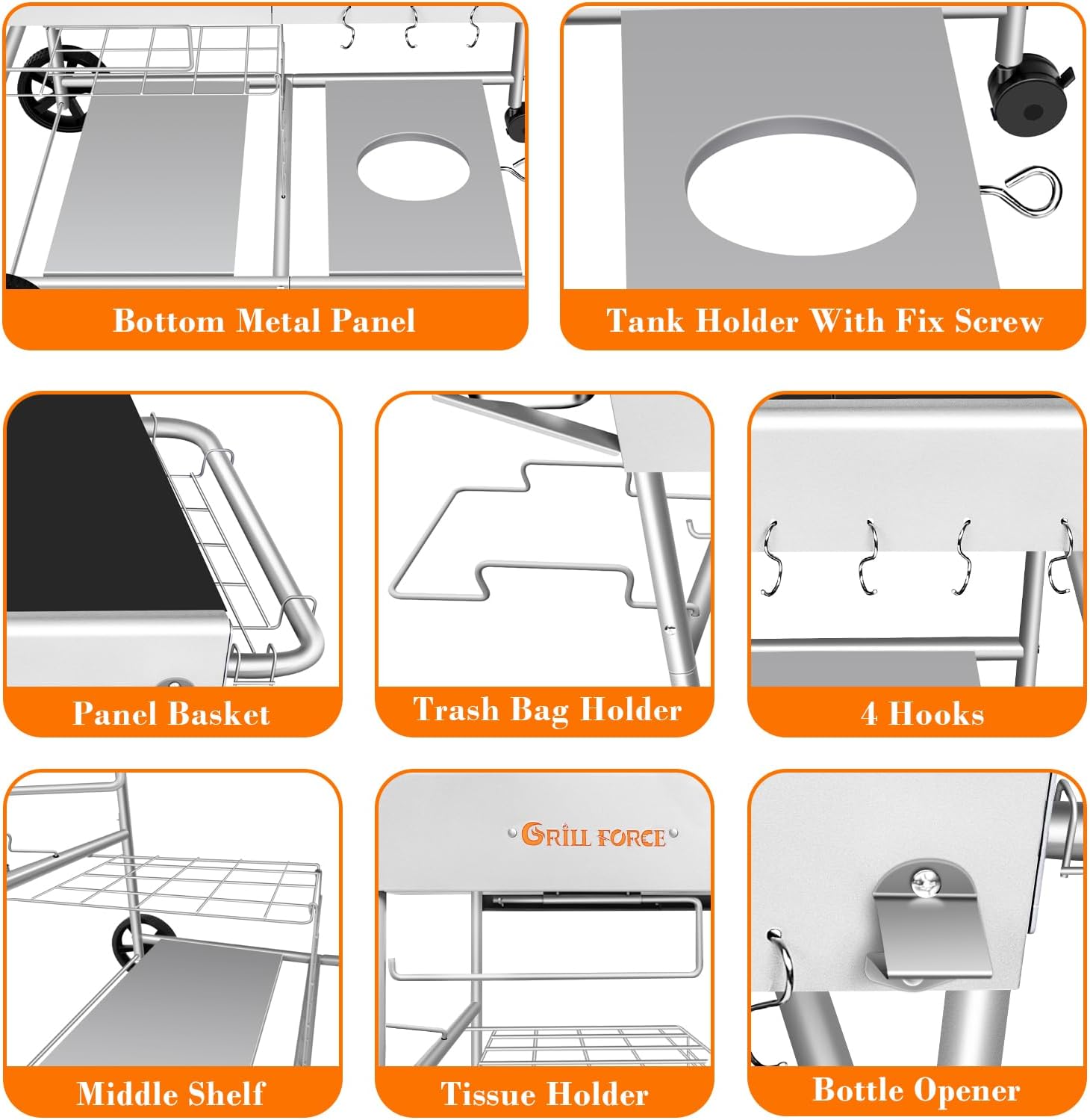 - 【Versatile and Convenient Features】This outdoor grill stand includes everything you need for professional-level cooking, such as a trash bag holder, paper towel holder, bottle opener, and four hooks for easy access to grilling accessories. The handle also comes with a grid basket for storing seasoning bottles and sauces.