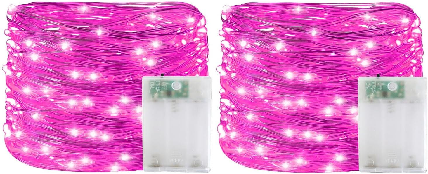 YAOZHOU Valentines Day Pink Decorations Fairy String Lights, Battery Operated with Timer, 2 Pack 33FT 100 Led Mini Battery Powered Lights, Mason Jar Waterproof Firefly Christmas Lights DIY Party