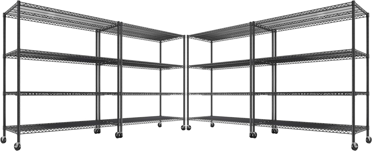 - 【Convenient Wheels】4 tier garage storage shelves have 4 adjustable feet, 4 industrial wheels(2 lockable). Wire storage rack on wheels can be easily positioned in pantry, kitchens, supermarkets, garages, closets, etc. Height-adjustable feet can be placed on uneven ground- simply twist to stabilize. Non-slip, will not scratch ground.Metal storage shelf is perfect choice for housewarming.