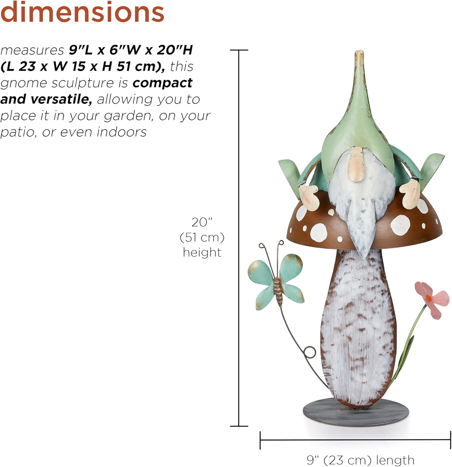 - IDEAL SIZE: At 20" H with a 9"L x 6"W base, this compact gnome sculpture fits effortlessly into any outdoor space. Perfect for gardens, porches, or near water features, it adds charm without dominating your landscape, enhancing both small and large areas