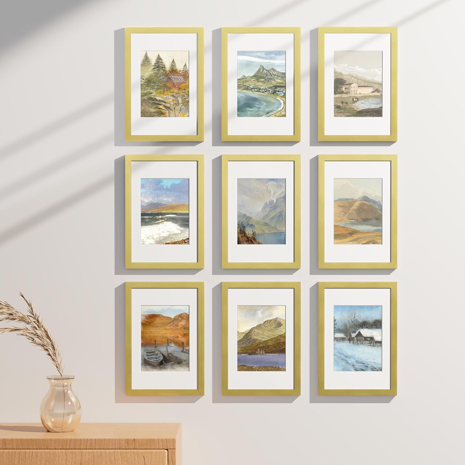 Vittanly 8x12 Picture Frames Set of 9, Shatter Resistant Plexiglass, Display 6x8 Pictures with Mat or 8x12 without Mat, Photo Frames for Wall or Tabletop, Engineered Wood, Gold
