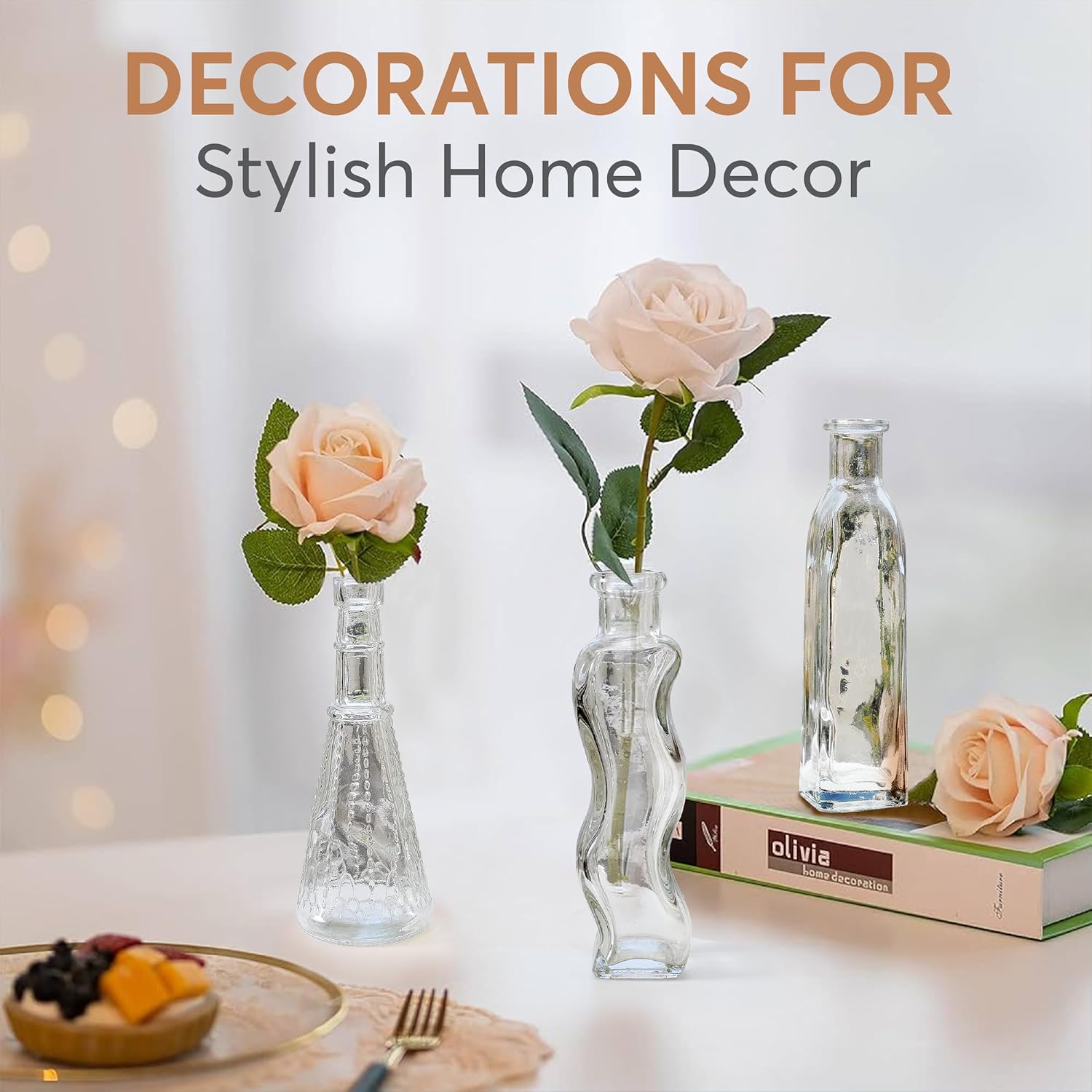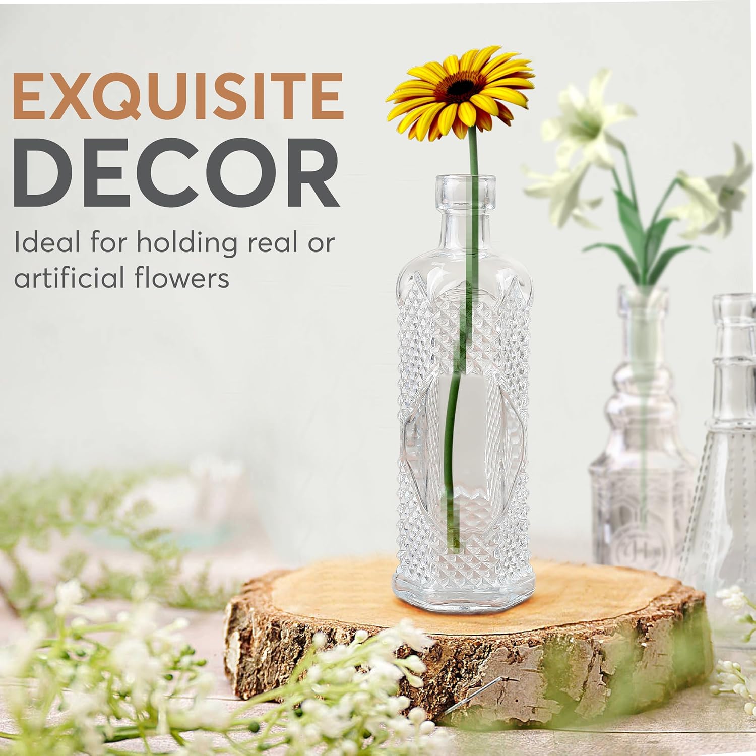- Vintage Vases for Timeless Elegance β Our 14-piece clear vases for centerpieces offer a variety of unique antique-inspired designs, and shapes to create a warm and inviting atmosphere. From slender amphora styles to wide robust designs, there's a bottle to suit every decor and project.