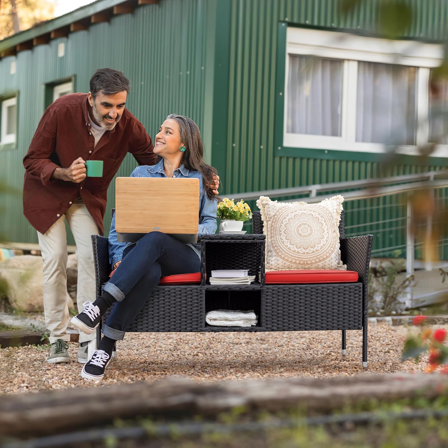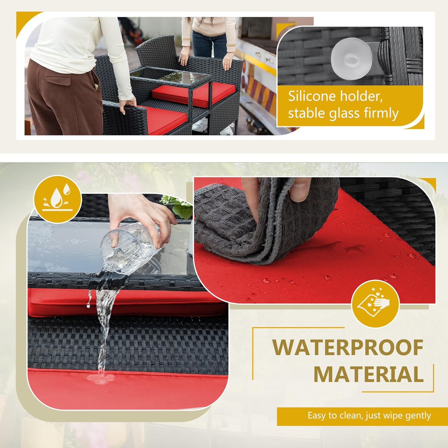 - Built-in Table & Storage: In the middle of the patio loveseat integrated storage compartment and small table, you can put some drinks, snacks, fruits within your reach in the tempered glass top. The small storage space below you can put books, tea cans and etc. This design saves your space and add more convenience.