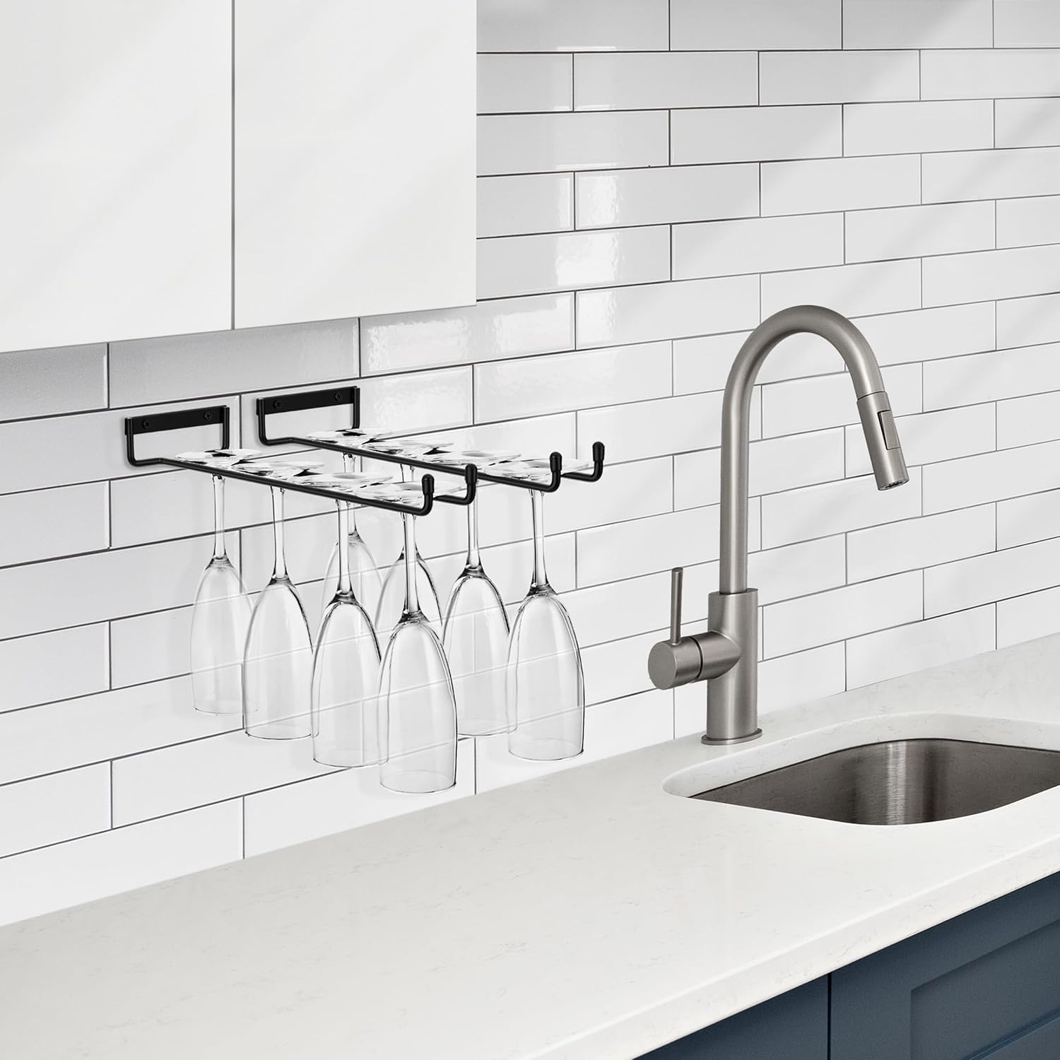- Under Cabinet Wine Glass Rack (2 Pack): Mounts directly under cupboard for visible storage of your glassware - Stores 3 of your favorite stemmed wine glasses or 4 champagne glasses per rack depending on the size - Can also be used as a mug shelf for mug storage - Use display shelf to organize your choice of glassware, china storage, bar wall decor, wine glass storage, and more