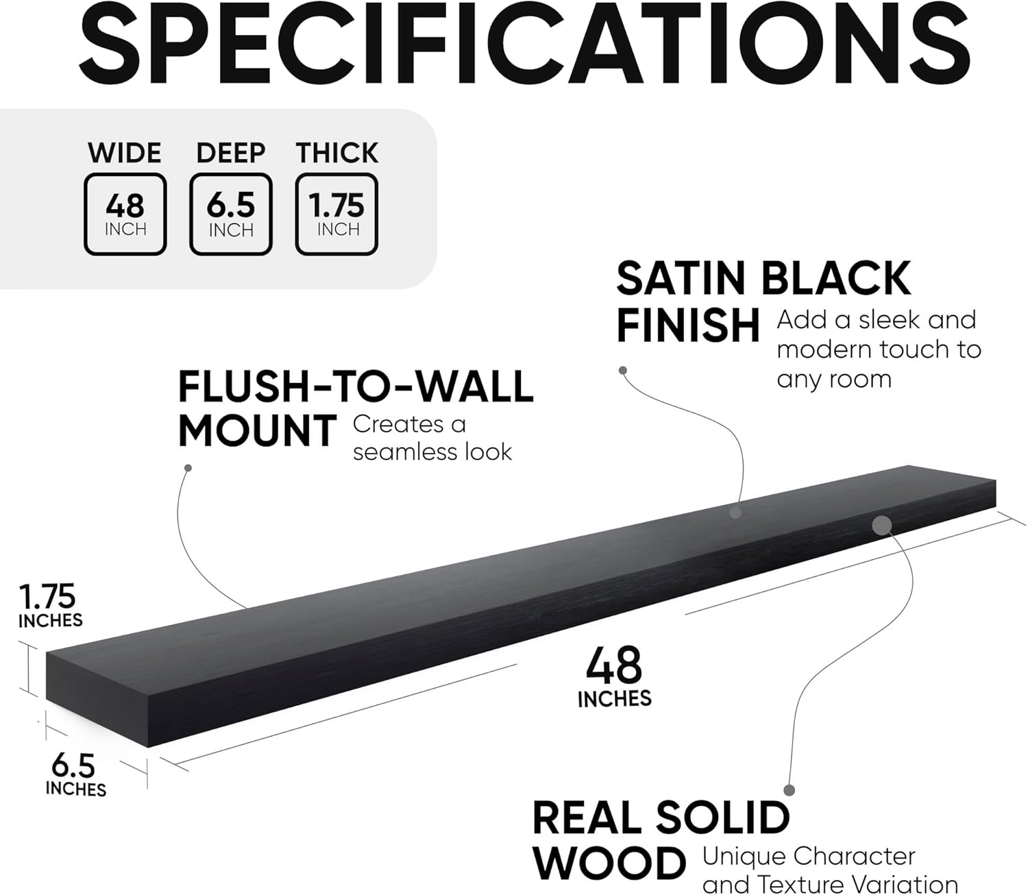 Homeforia Black Floating Shelf 48 inches, High End Solid Real Wood 48 inch Long Floating Shelves for Wall, Black Wooden 48inch Large Floating Shelves, Heavy Duty Bracket, 48 X 6.5 X 1.75 in, Set of 2