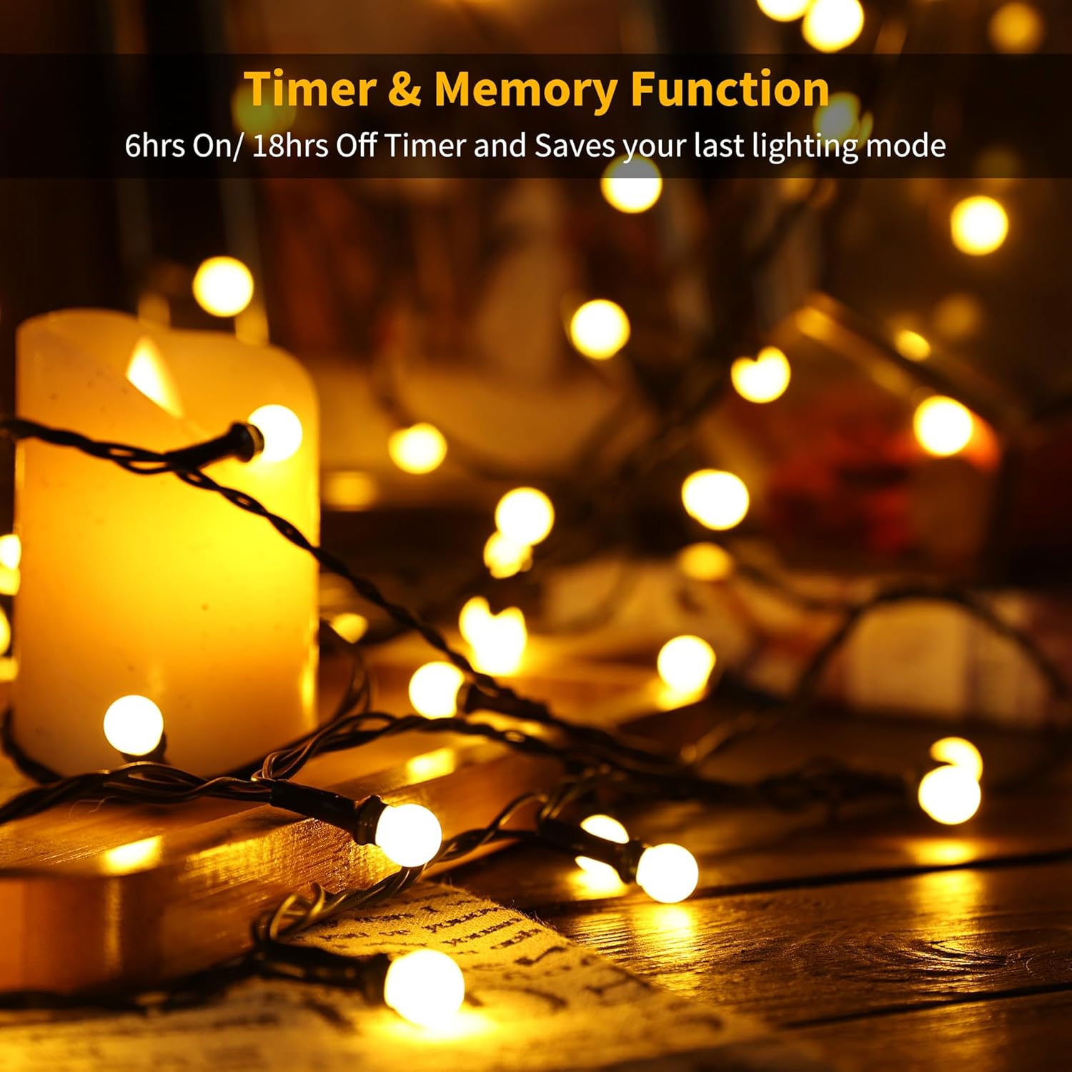- Memory & Timer Function: Enjoy convenience with these warm white string lights' memory and timer function, simply to select the favorite lighting mode and set the timer via adapter for lights to light up your favorite mode for 6 hours and off for 18 hours daily.