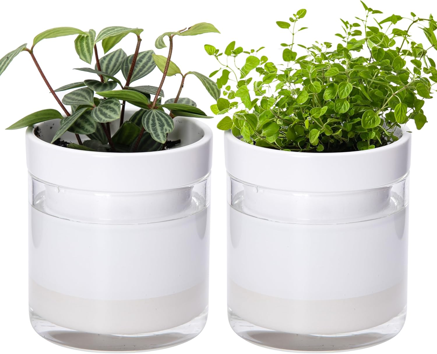 Phoenix Vine 4 Inch Self Watering Planter, White Terracotta Clay Pot with Glass Reservoir for Indoor Plants, Herbs, Flowers, Set of 2, 52-B-E-2