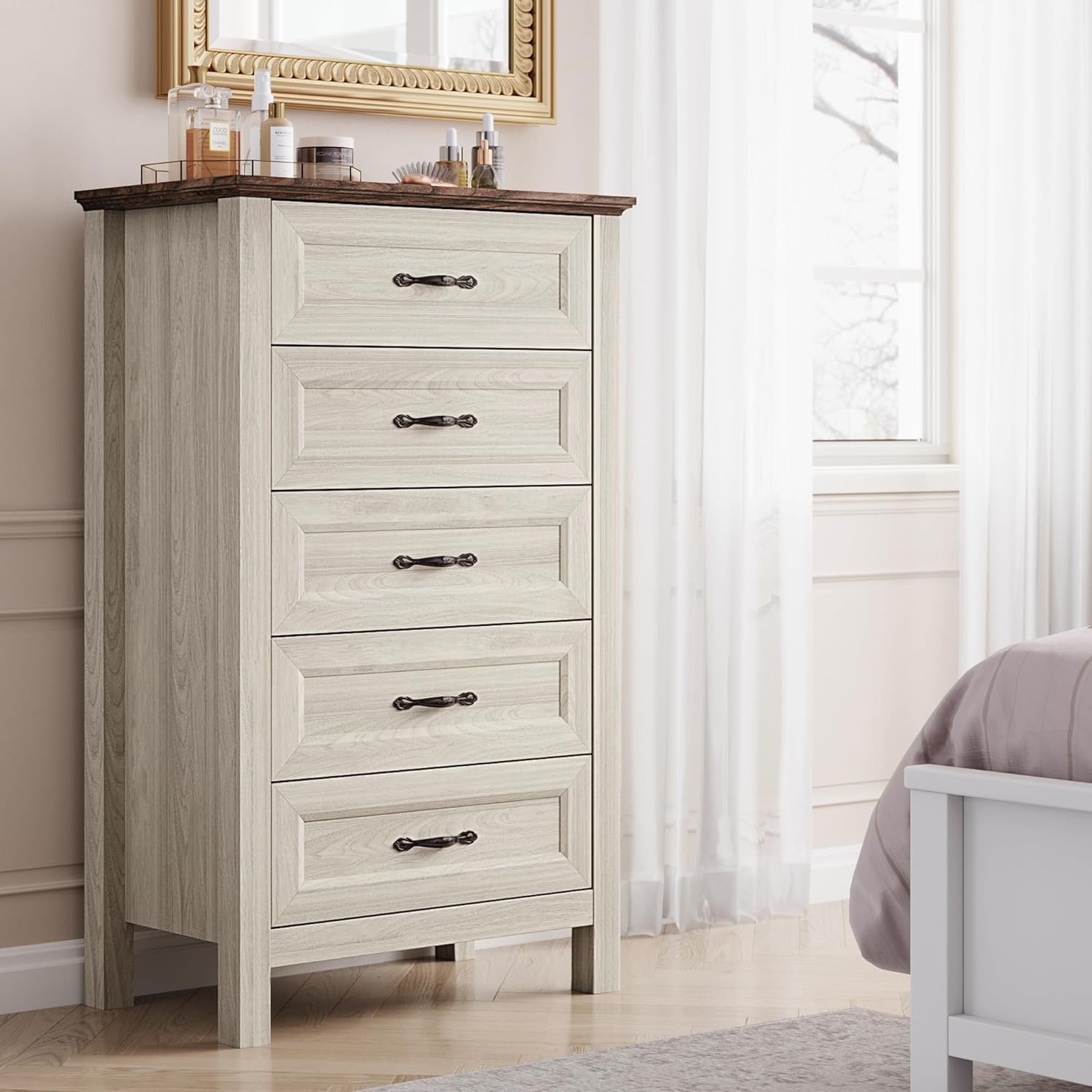 LINSY HOME 5 Drawers Dresser for Bedroom, Wood Tall Bedroom Chest of Drawers with Metal Handle, Farmhouse Dressers Organizer for Living Room, Closet, Hallway, White Oak