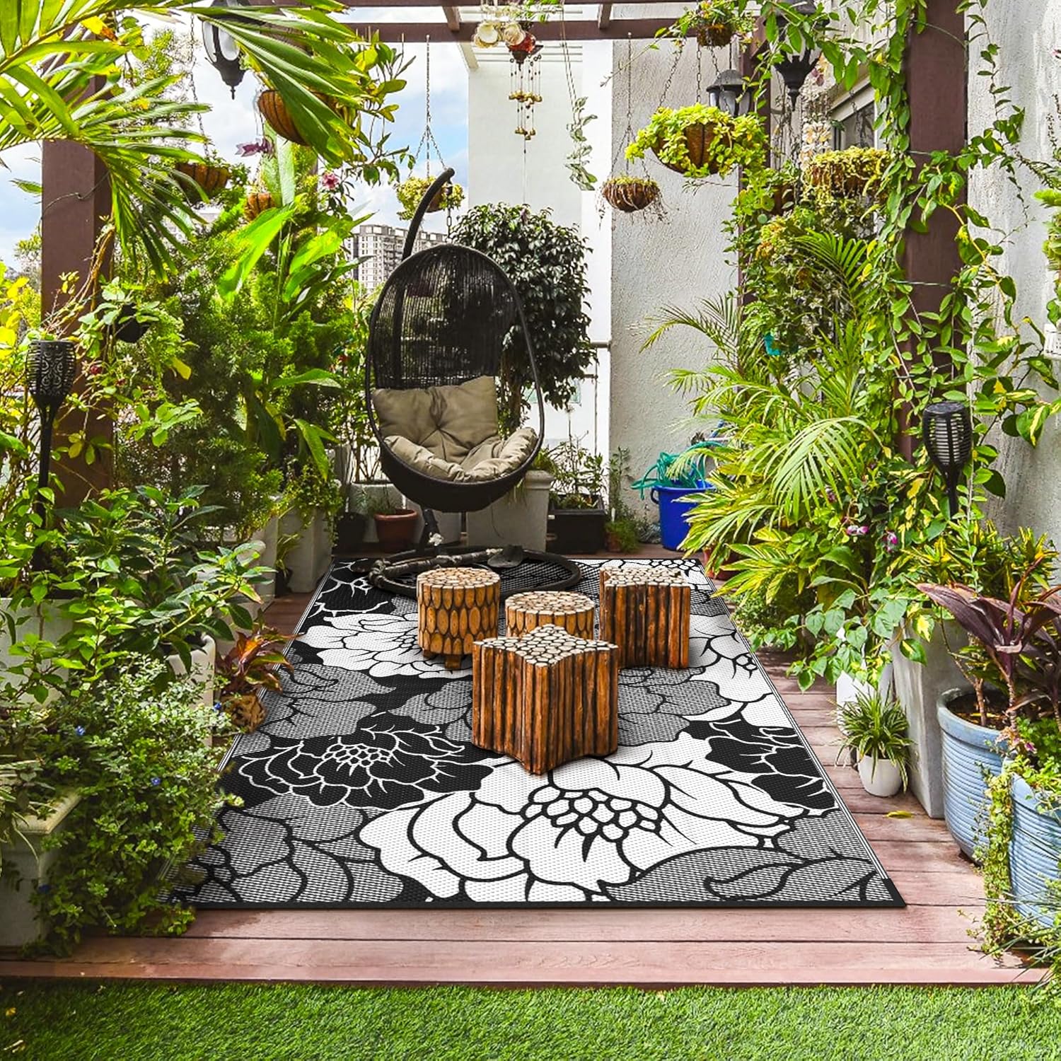 - Upgraded Material: The Outdoor area rug is made of 100% virgin polypropylene, crafted with care for sustainability, and is double-sided woven for extra durability. The stitching of the outdoor carpet is flat and fine with neat edges. Plus, the high-end UV coating and edge heat treatment technology prevent fading and sun damage without worrying about wear and tear