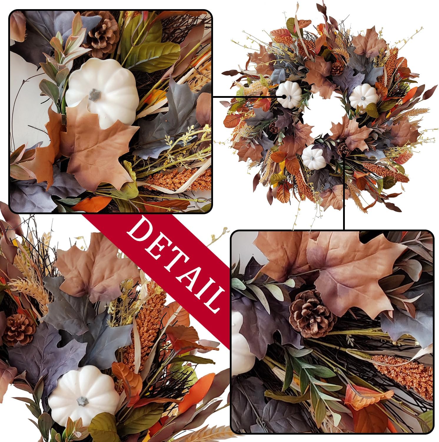 WANNA-CUL 24 Inch Fall Wreath for Front Door with White Pumpkins,Grains, Maple Leaves-Fall Decoration for Home-Large Fall Decor Door Wreath for Autumn,Harvest or Halloween