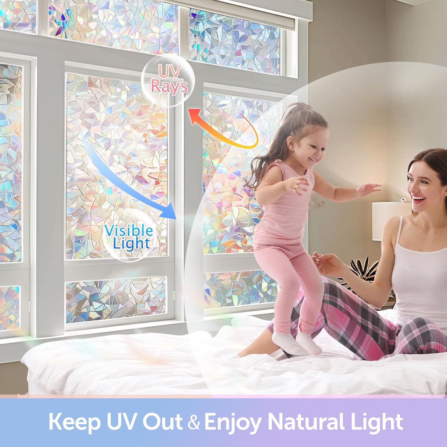 - NO GLUE & Reusable: No glue design keeps you away from the trouble of toxic chemical glue. Rainbow window film is easy to install and remove without any residue. More important, you can remove and use it again. The more water you use, the firmer the window film decorative will stick, soapy water is better.