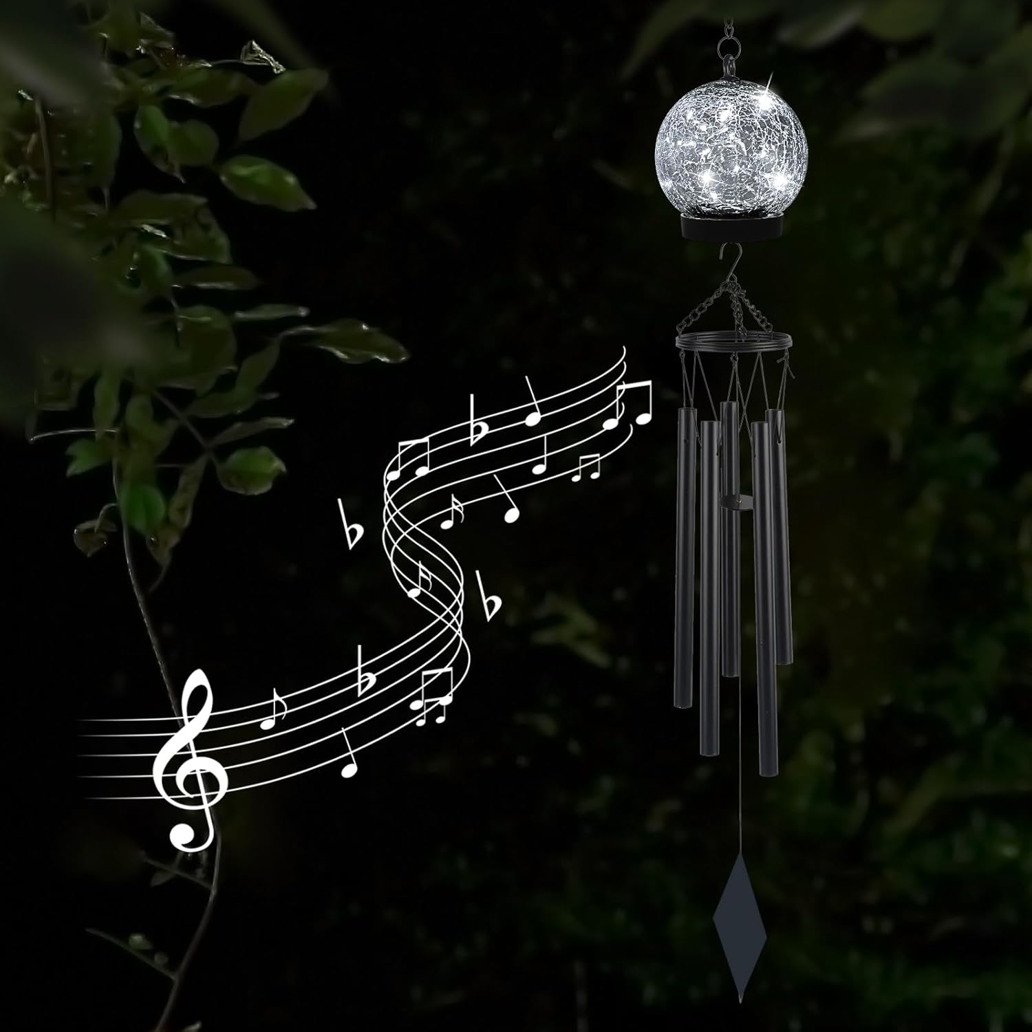 - 【Excellent Design】Elegant wind chimes with crackle glass globes, Each metal tube has sleek clean line. Solar wind chimes will shine in sunlight and like cool white fairy in night. Creating a happy atmosphere and enjoying the beautiful windchimes in Garden.