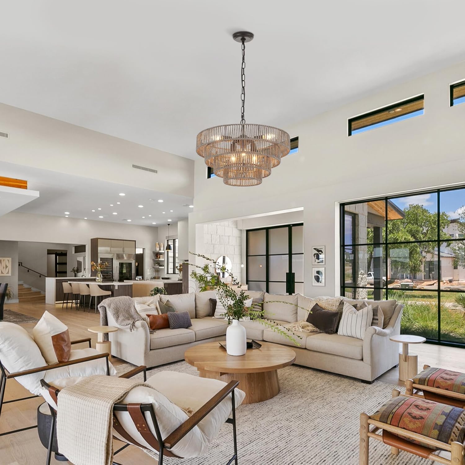 - Eye-catching Design: This woven rattan chandelier is made of wicker woven on grey color with high-quality 4 round metal frames finished by brass, forming a semicircular hollow cage; The color gray exudes a casual elegance without sacrificing style, revealing an indescribable high-level charm for this modern chandelier.