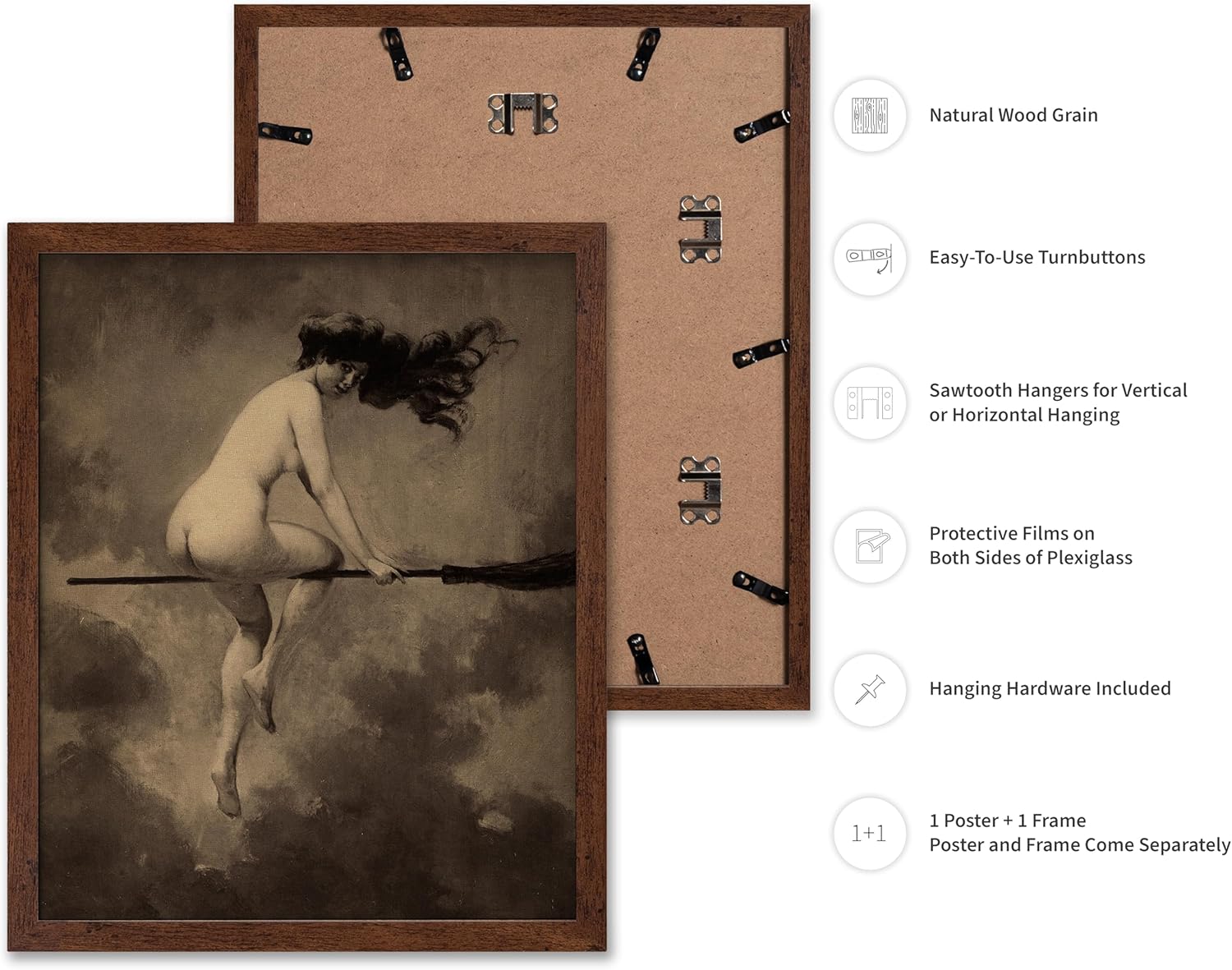 Poster Master Vintage Albert Joseph Penot Poster - Retro Halloween Print - Gift for Artist, Friend - Departure for the Sabbath, Naked Witch on Broom - Wall Decor for Bedroom, 16x20 Brown Framed