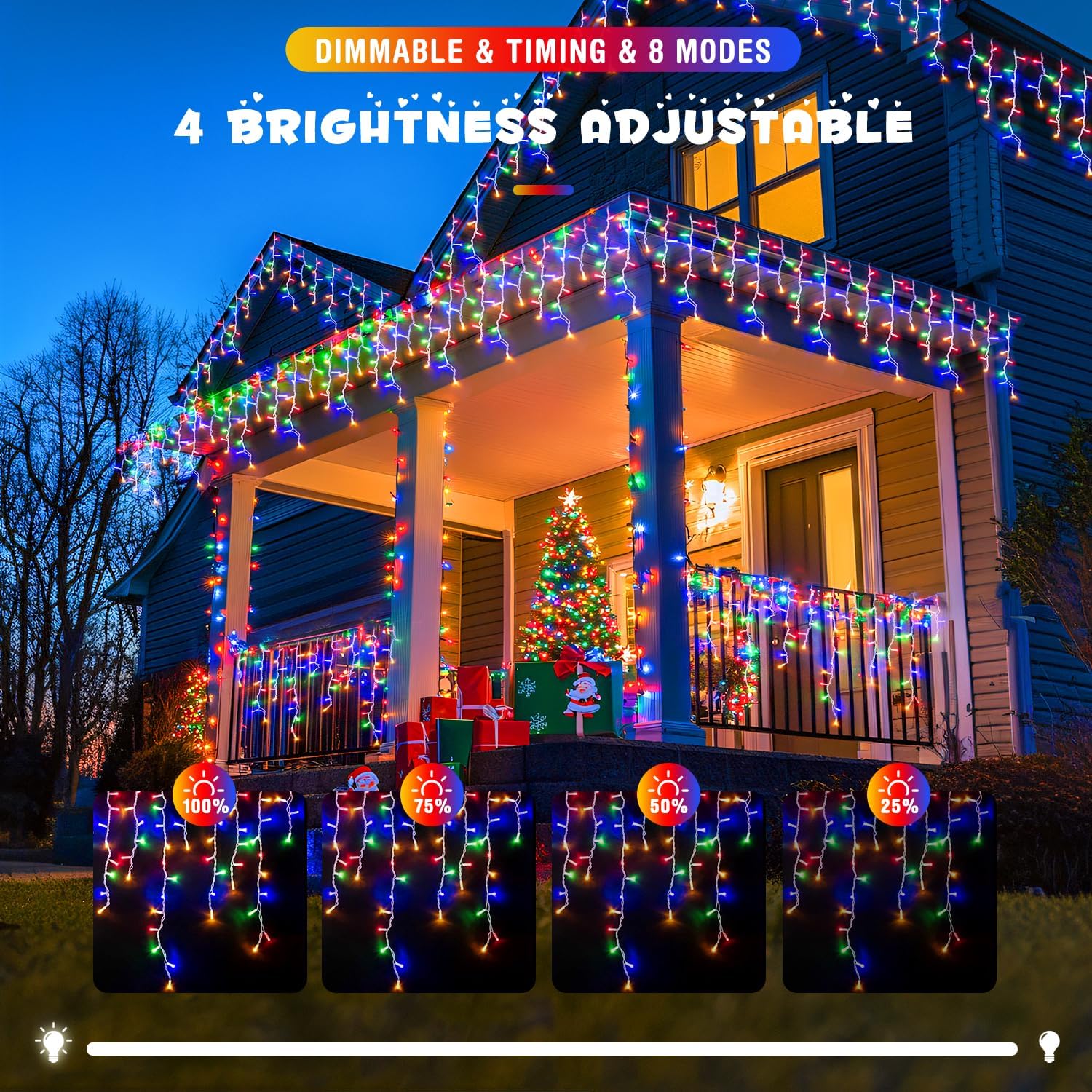 - 【8 Lighting Modes & Timer Function 】 Multiple selection of light patterns. the different settings are a lot of fun. Fascinating multicolor icicle lights for my porch with colorful lighting options! They look gorgeous in Mode 'Chasing/Flash' on our patio. Of course Mode ‘Twinkle/flash’ is very Christmas. Our icicle lights also have timing function, which automatically turns on for 6 hours and turns off for 18 hours