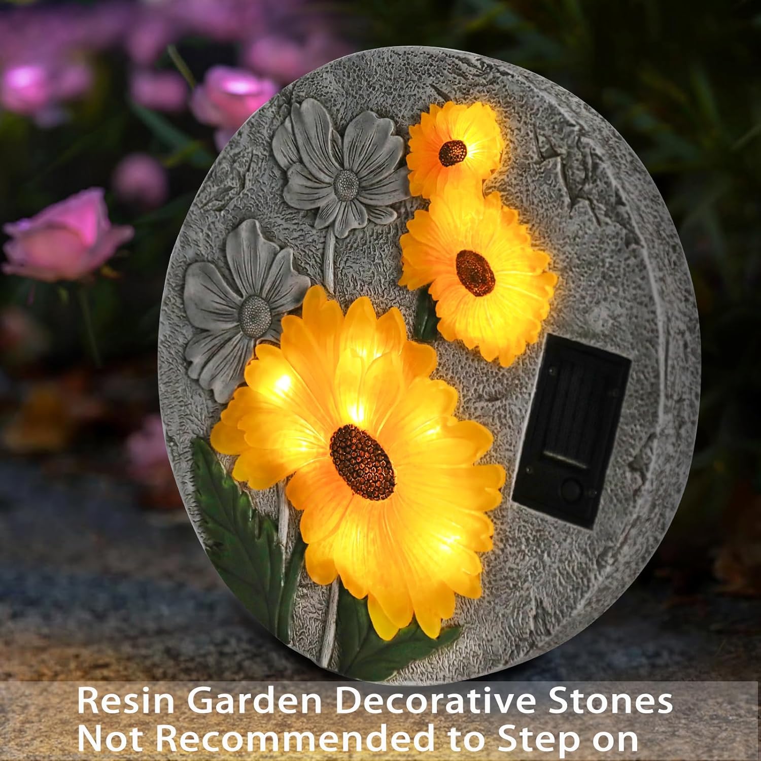- Hand Craft Garden Stones: Realistic and delicate resin sunflower garden stones with a classic gray white base stone finish, adorned with lifelike sunflowers, can bring vitality to your garden. At night, sunflower lights will light up your garden and path, creating a warm atmosphere for your garden