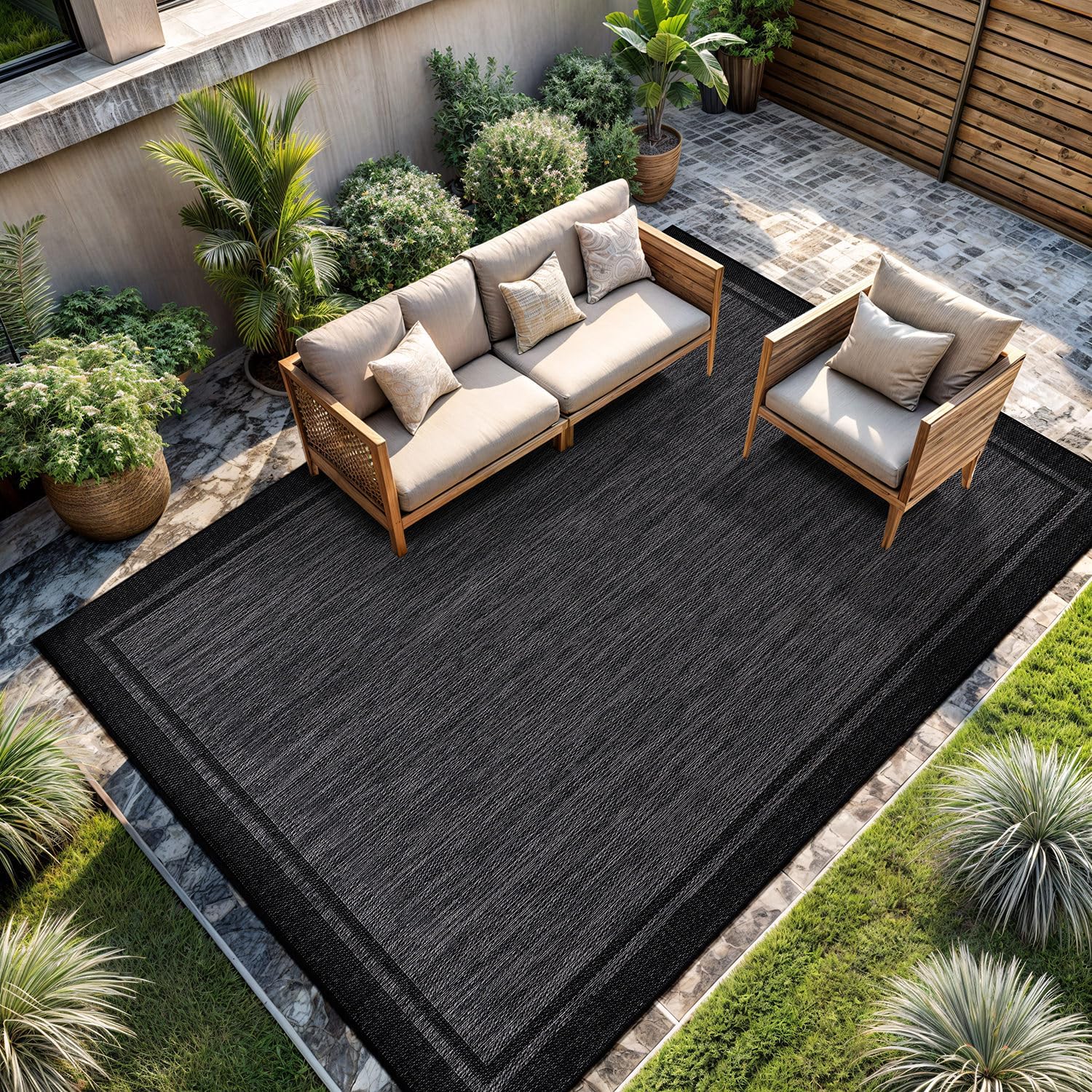 CAMILSON Indoor Outdoor Rug, 10x14 Bordered Dark Grey Black Modern Large Area Rugs for Indoor and Outdoor Patios, Kitchen and Hallway Mats, Washable Porch Deck Outside Carpet (Bordered Black, 10 x 14)