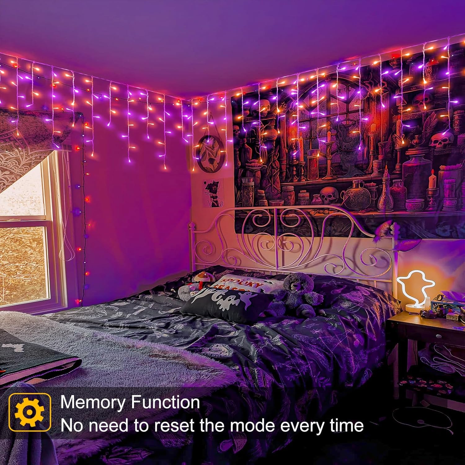 - Upgraded 8 Modes Halloween Lights: The icicle Lights for outside have 8 selections of light pattern: 1.Combination 2.In Waves 3.Sequential 4.Slo-Glo 5.Chasing/Flash 6.Slow Fade 7.Twinkle/Flash 8.Steady On. Different lighting effects are controlled by the button on the plug. These beautiful and vibrant outdoor lights will bring you a lot of festive atmosphere.