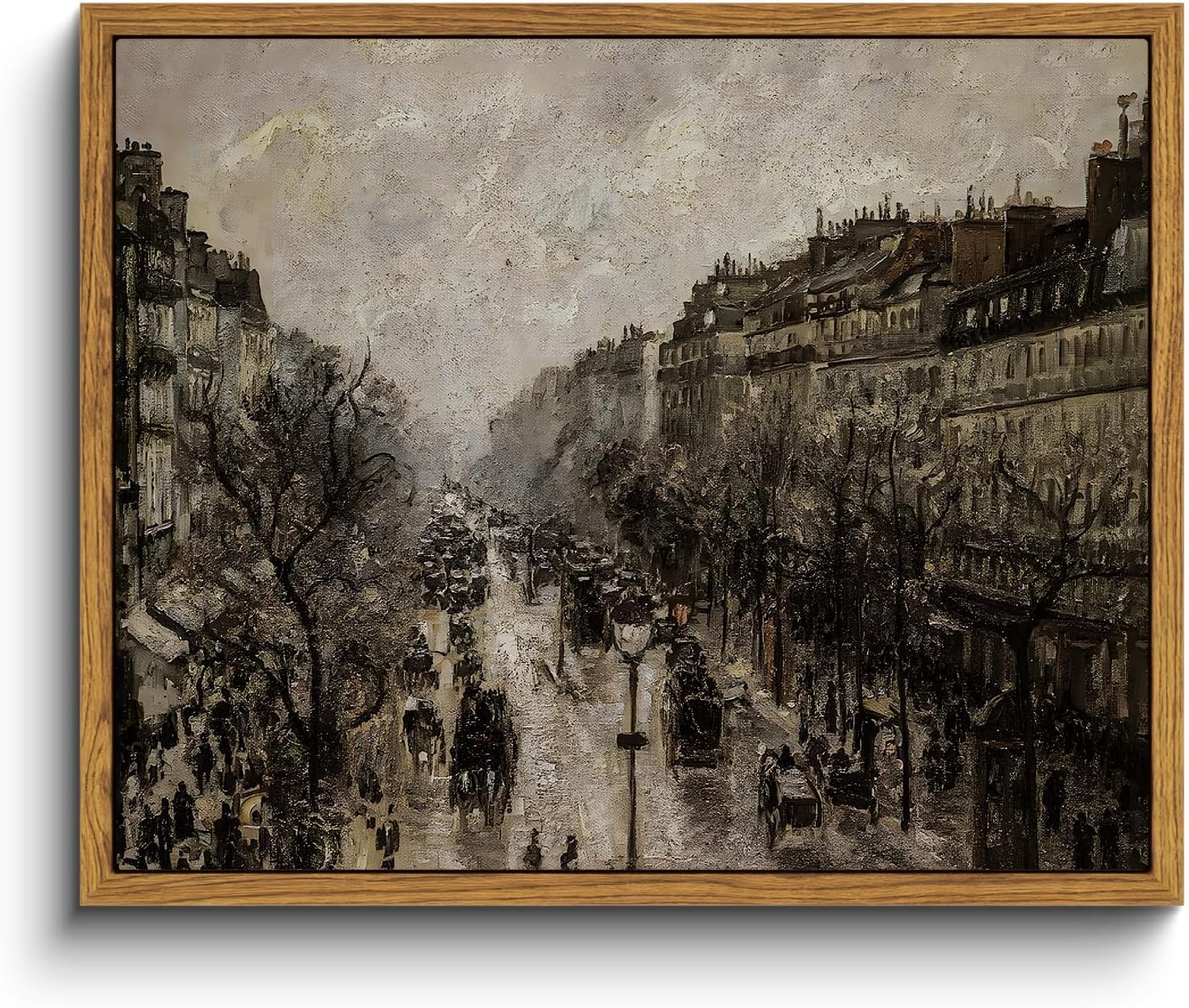 - VINTAGE FRAMED WALL ART DECOR: This painting, "Boulevard Montmartre ร Paris" is the work of 19th century French artist Camille Pissarro. This work captures wall art decor not just a Parisian street, but a moment in time, alive with movement and the charm of city life in the rain. This vintage landscape painting can add more classic and elegant elements to your space.