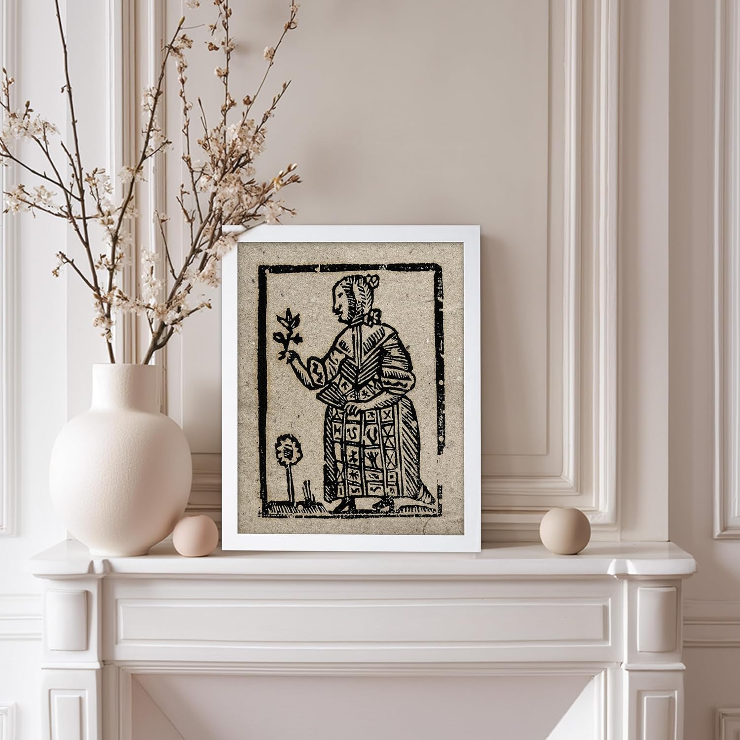 Poster Master Vintage Woodcut Poster - Retro Medieval Print - Gift for Gothic, Horror Fan - Witch Holding a Plant, Magic, Spell, Herbalist - Wall Decor for Bedroom, Dorm, 11x14 White Framed