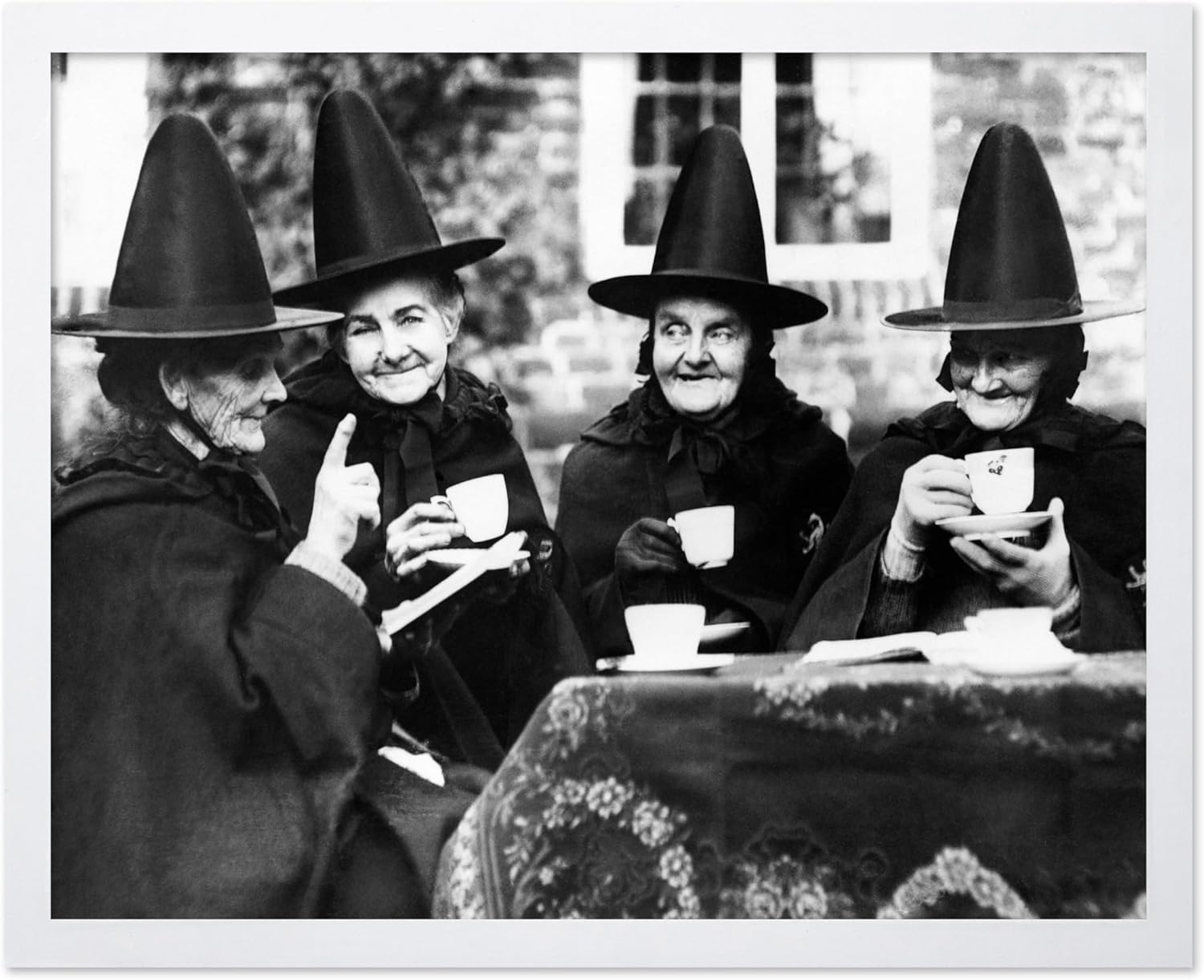 Poster Master Classic Photograph Poster - Vintage Halloween Print - Gift for Artist, Friend - Witches Tea Party, Old Women Smiling, Wearing Robes - Wall Decor for Living Room, 16x20 White Framed