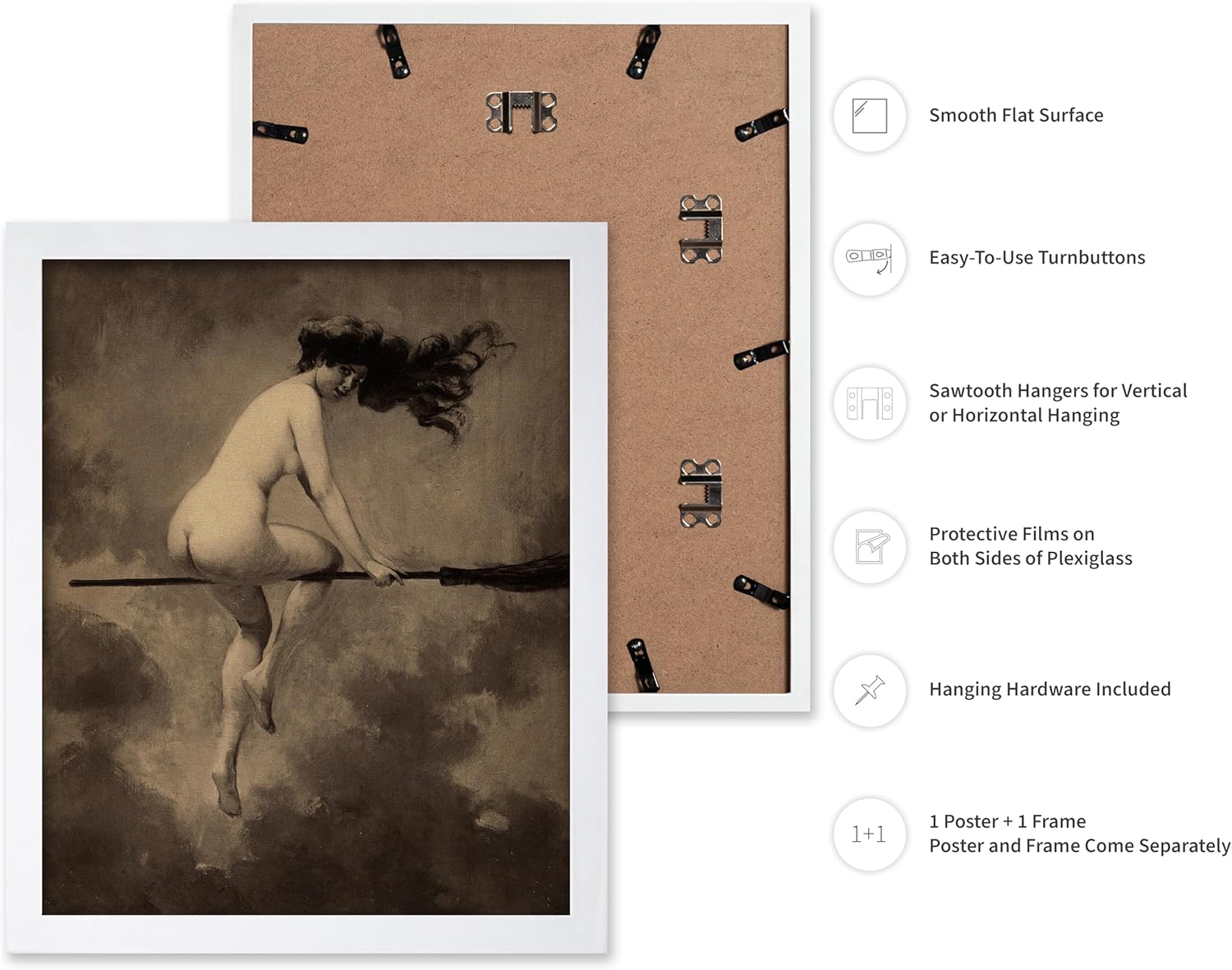 Poster Master Vintage Albert Joseph Penot Poster - Retro Halloween Print - Gift for Artist, Friend - Departure for the Sabbath, Naked Witch on Broom - Wall Decor for Bedroom, 8x10 White Framed