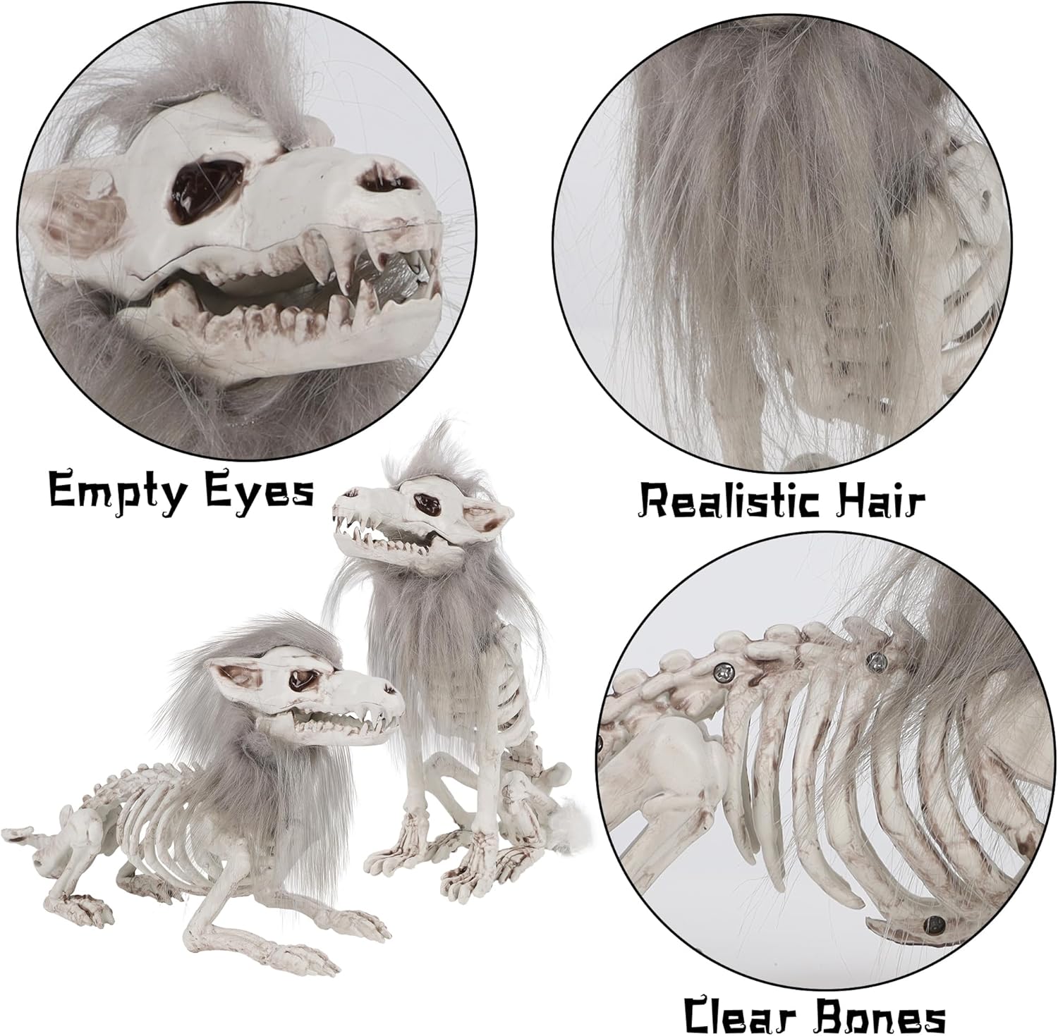 - Package Includes: This Halloween skeleton set includes 2 skeleton wolves designed for both indoor and outdoor spooky decoration. The two wolves either lie on the ground or squat and look ahead, each in different poses.