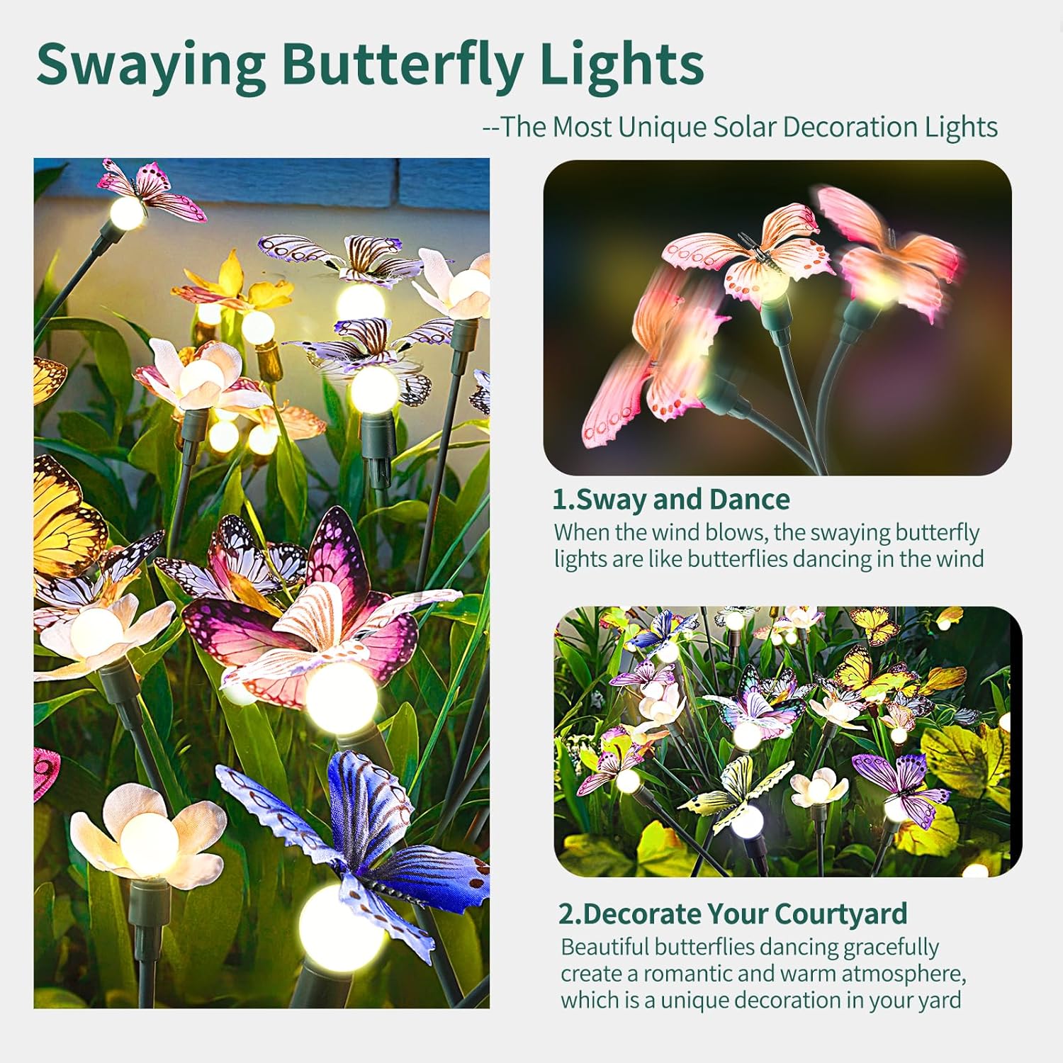 - 【SWAVING BUTTERFLIES,THE MOST BEAUTIFUL BUTTERFFLY DECORATION 】 The solar outdoor lights can emit warm white soft light, creating a romantic and festive atmosphere. They are the perfect outdoor decor for garden, courtyard, lawn, pathway, as well as any occasion such as Christmas, weddings, New Year's, parties, etc.