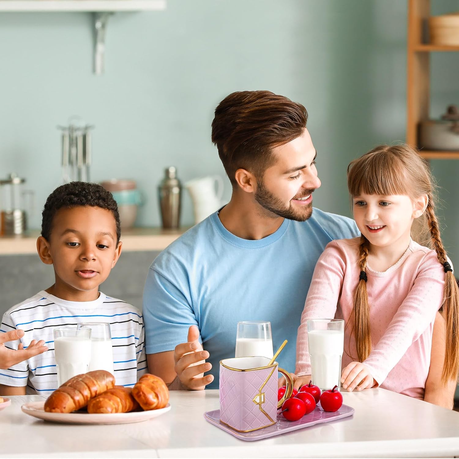 Zubebe 1 Set Coffee Mug Elegant Handbag Shaped Cup Modern Ceramic Purse Mug with Spoon and Saucer, 10oz Cute Creative Tea Cup for Office Home Woman Girls Gift (Purple)