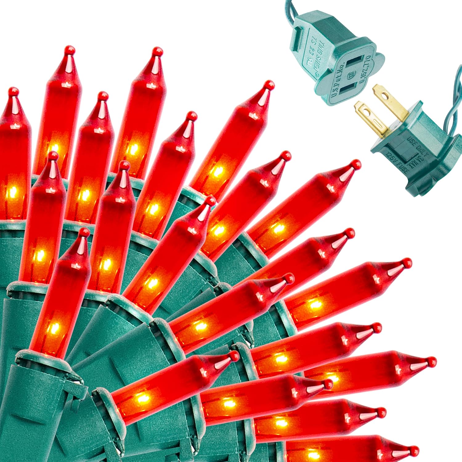 - Super Value Pack. Our Halloween incandescent string lights have a total of 200 incandescent red T5 bulbs with green wire, 100 Incandescent each. 40.8W 120V. Total Lighted Length is 43Feet, 19.4 Feet each. Total Wired Length is 42.8 Feet, 21.4 Feet each. Bulb Spacing 2.36 inches. High Voltage.