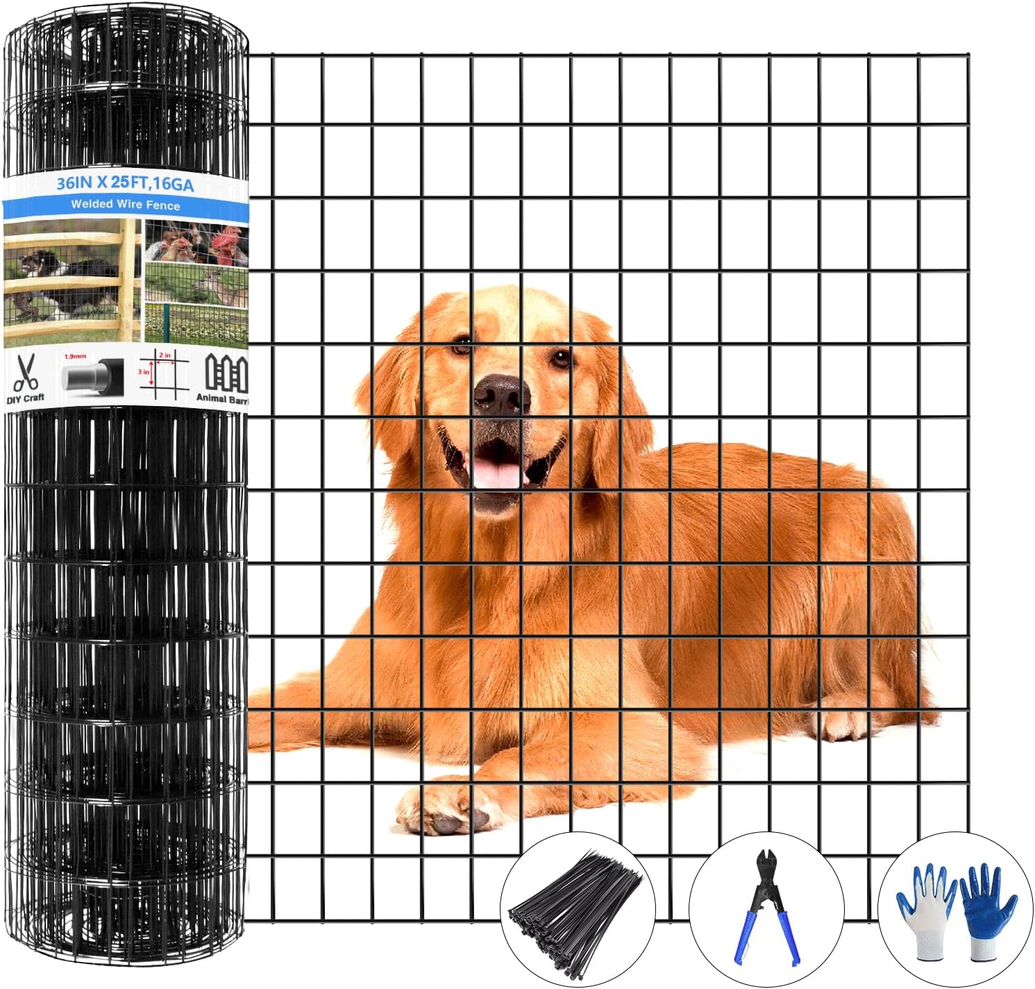 Welded Wire Fence, 25ft(L) x 36inch(H) Garden Fence for Dog, 2 Inch x 3 Inch 16GA Fencing for Chicken, PVC Coated Anti-Rust Roll Metal Wire Mesh Fence for Yard Vegetable, Black