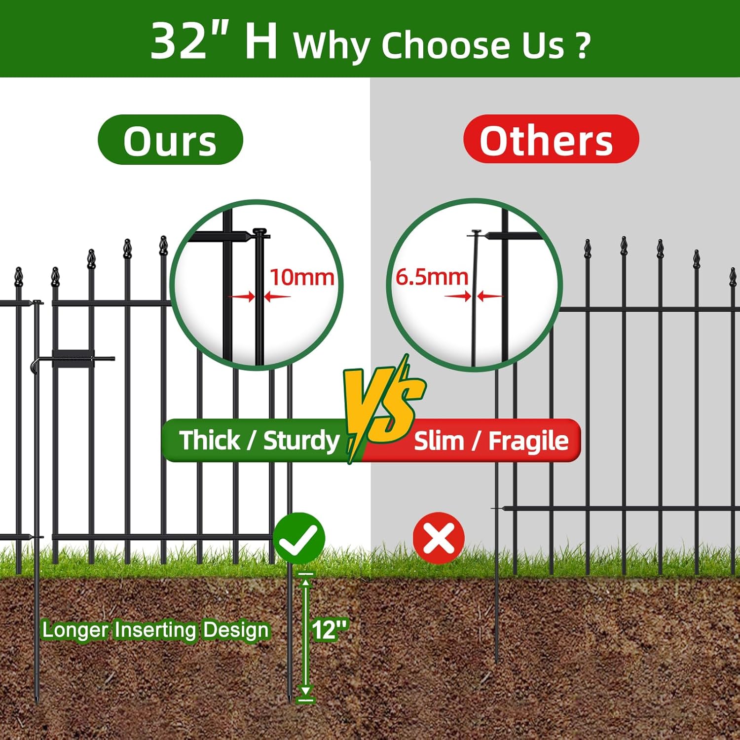 - ATTRACTIVE DESIGN: This 32 inch tall yard fence with black powder coated finish is durable for outdoor using, classically designed Roman Column decoration on arch patterns, which makes garden fencing more attractive.