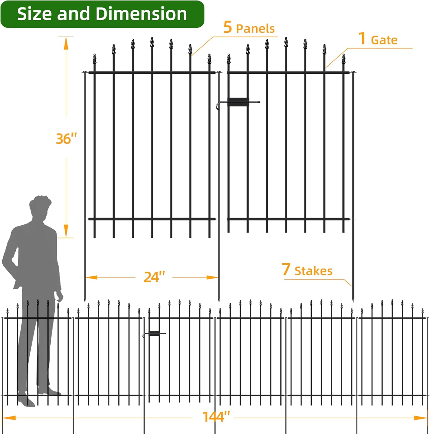 - WHAT'S INCLUDED: 1 Gate + 5 Panels + 7 Stakes in a bundle. Gate sized 35”(H) x 24”(W), each Fence Panel sized 36"(H) x 24"(W), each stake height 42 inch, the linear length 12 feet, Black color.
