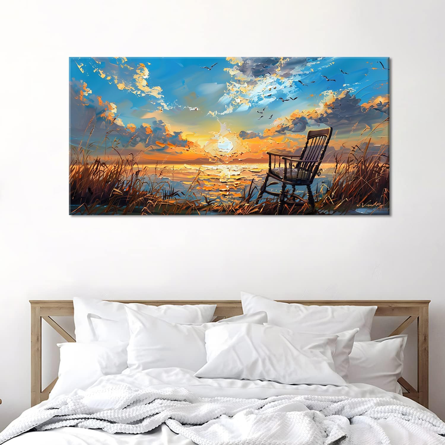 - 【Durability & Waterproof Canvas Wall Art】 - This Blue Sea Sunset White Beach Painting are made of high-quality canvas material to ensure durability, and we print with high-quality inks, never fade over time.Also wrapped in a wood frame that will last,tightly stretched to ensure the canvas won't crease and bend.