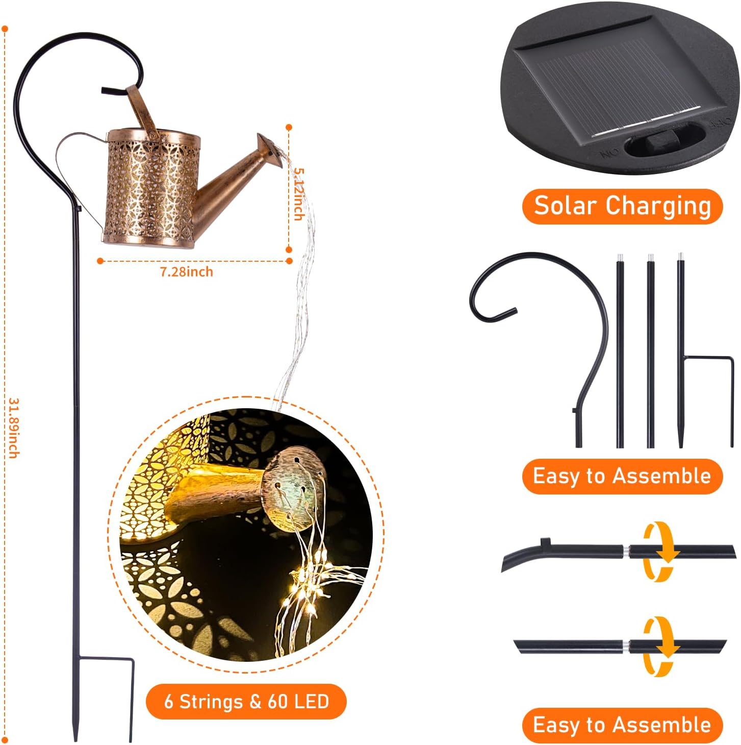 - Tool-Free Solar Watering Can Light: Installs in just 3 minutes with 3 simple steps: 1. Attach handle & hook 2. Insert into lawn 3. Hang the light. No wiring or external power needed.