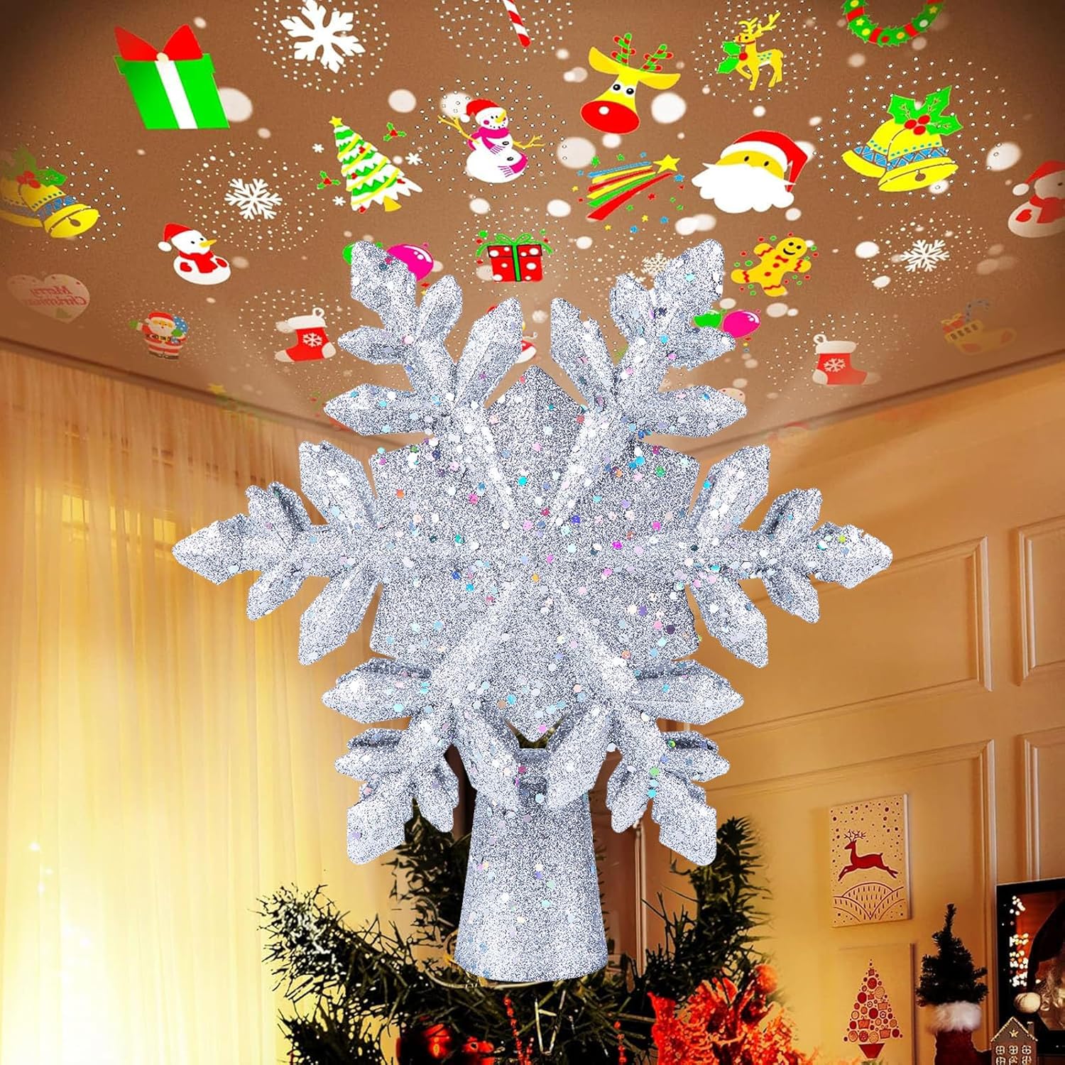 Christmas Tree Topper Lighted with 6 Projection Modes, 9.6” Hollowed Snowflake Tree Topper with Silver Spangles Plug in for Indoor Home Xmas New Year Party Holiday Night Tree Decor