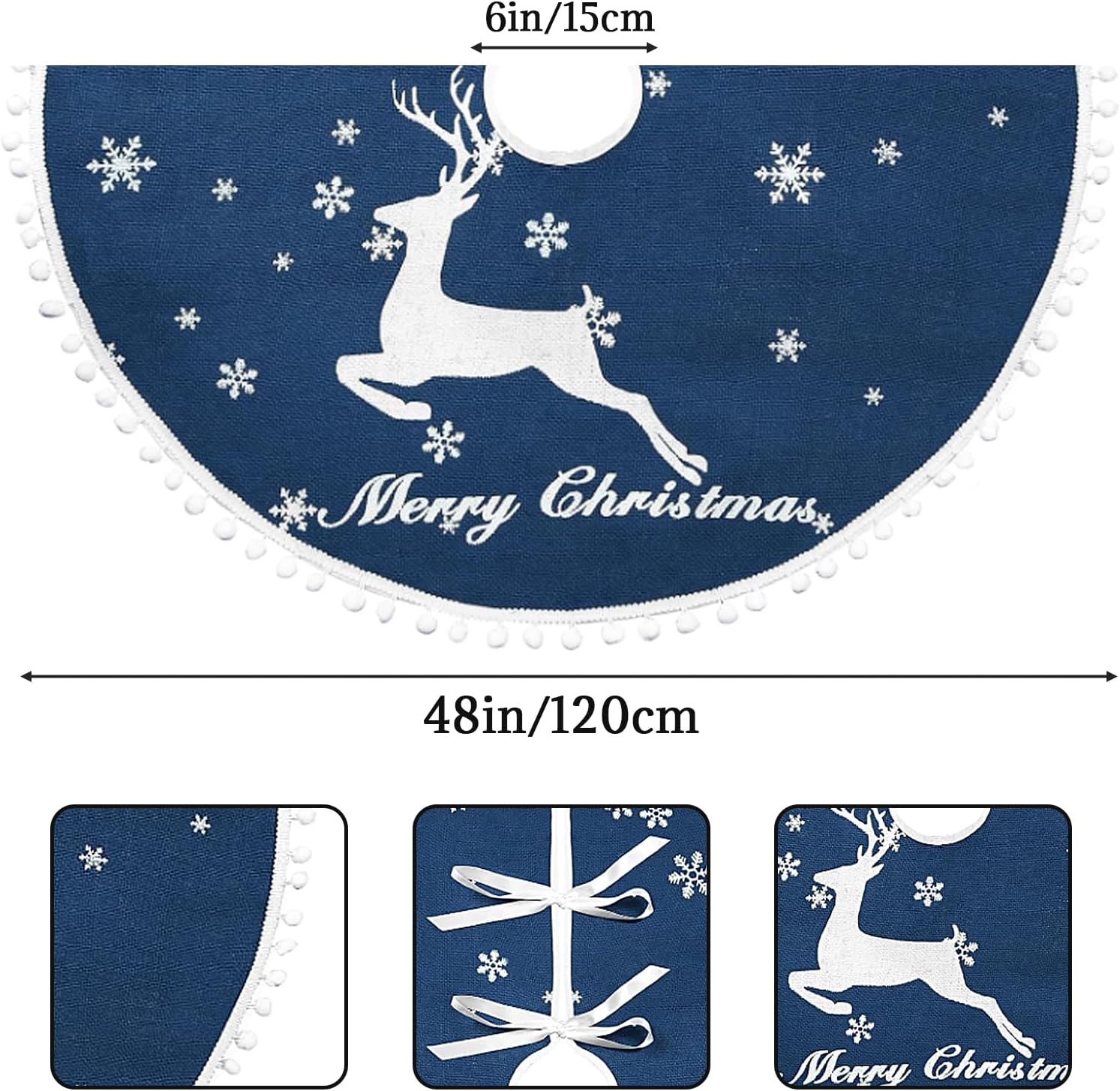 - Merry Christmas Tree Skirts:Our xmas tree skirt is printed with elk and various sizes of snow patterns, as well as the words "Merry Christmas." The edges are adorned with small, fluffy balls, adding a festive touch to your Christmas tree. This 48-inch tree skirt is perfectly sized for most Christmas trees perfectly. Before making a purchase, please measure the diameter of your tree to ensure a perfect fit