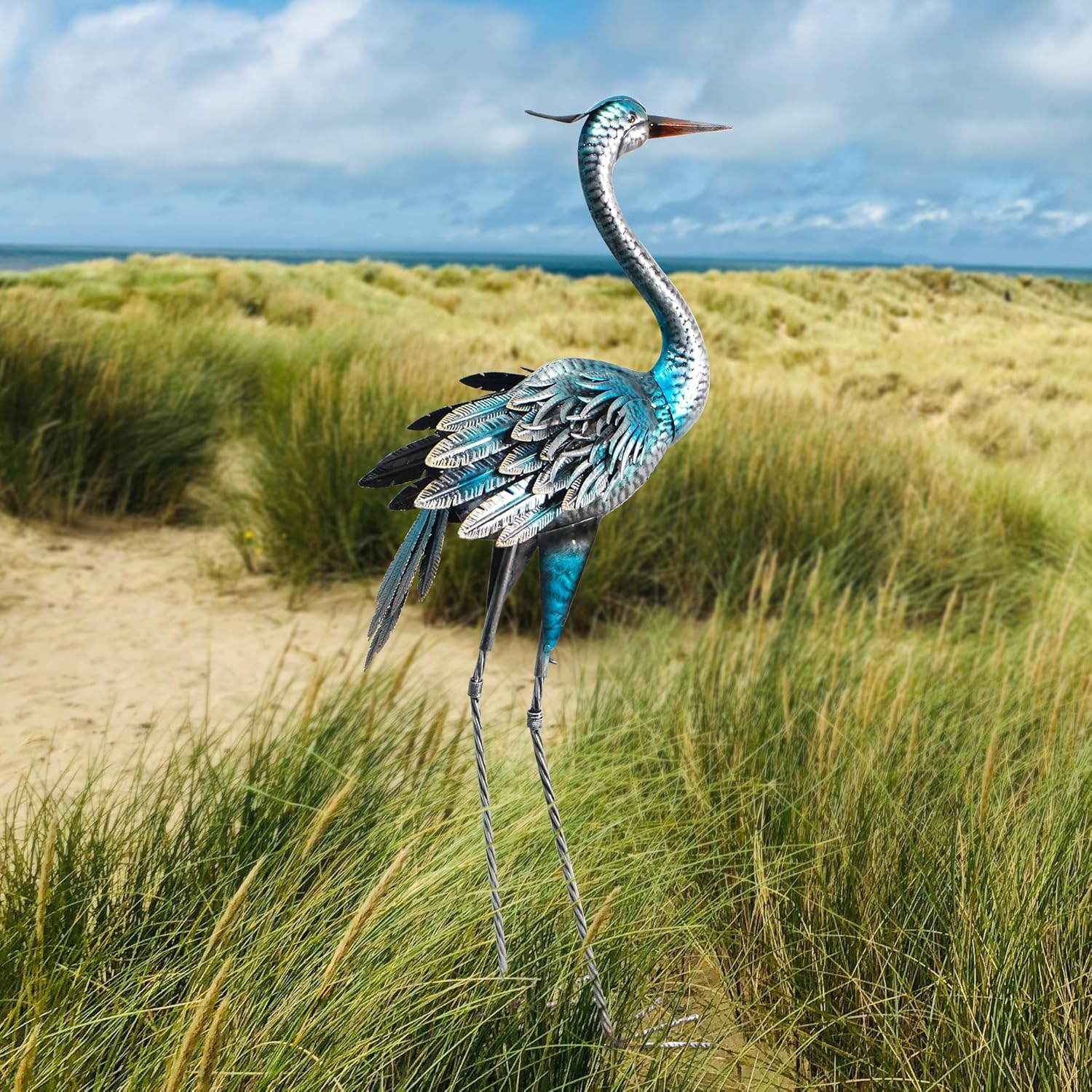 - Stable Garden Decor: The feet of the crane sculpture are U-shaped design and the package including 2 U-shaped stakes, U-shaped stakes can sink deeper in the ground for better securing