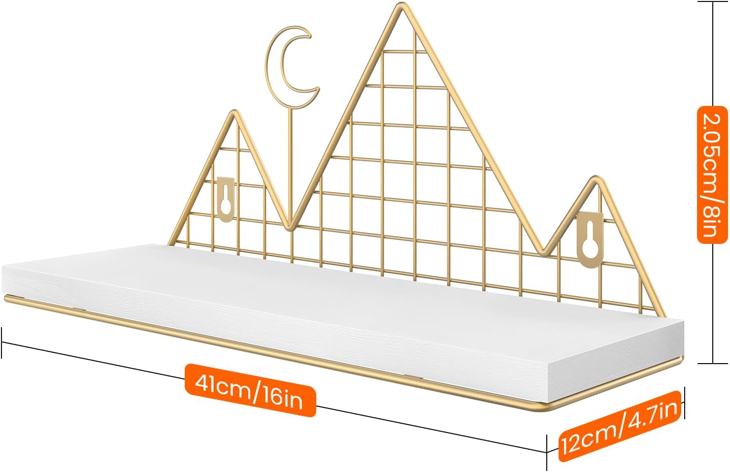 - Unique Mountain Design: Each mountain shelf in this set of 2 features a striking white wood plank paired with gold metal wire mountains, creating a whimsical and elegant focal point in any room.