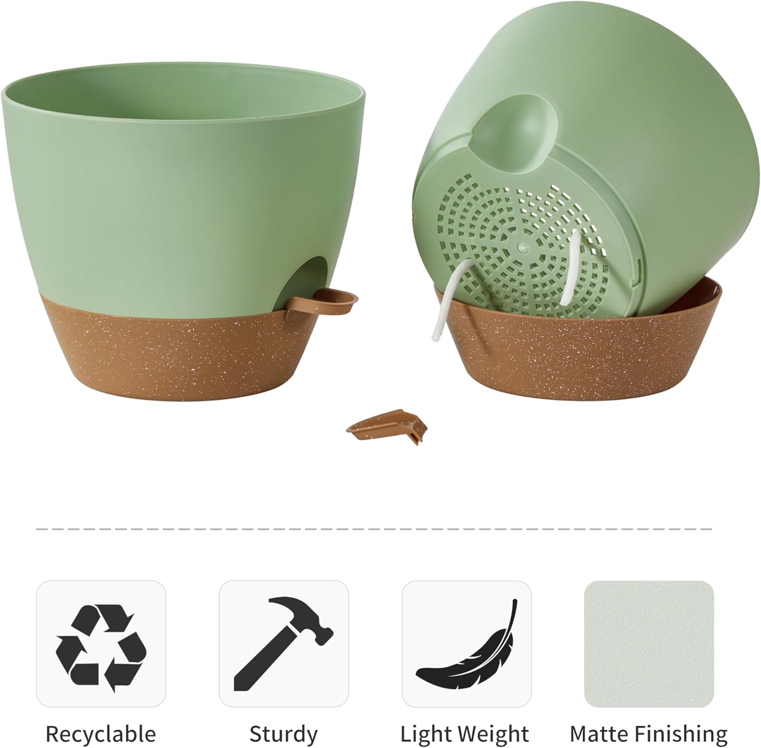 FaithLand 3-Pack Planter Pots, 10 9 8 Inch Self Watering Flower Pots for Indoor Outdoor Garden Plants, Green with Brown
